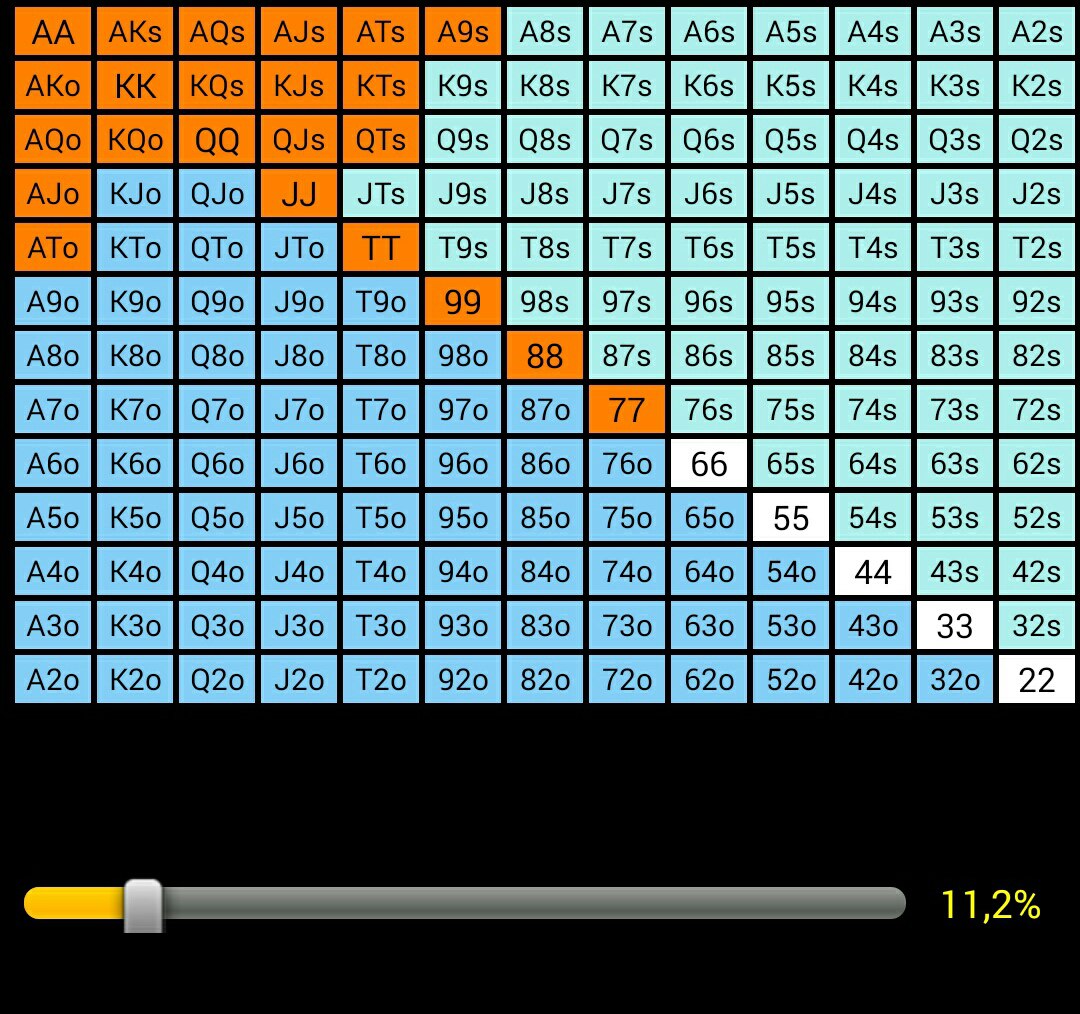 >>30114 150 рук open ep 21% (пикча 1) 4бет рендж с ЕР 6.7(3) фолд на 3бет с ер 25%(4) рендж колла 3бета 11.1%(4) агра по улицам 2\1.6\14 и стат на который я не обратил внимание WTSD 15% Итак мы имеем 15.75% рейнжа, которые он не фолдит на 3бет. Из них вычитаем 6.7% которые уходят в 4бет или пуш и на выходе имеем 9.05% (пикча 2) которые он коллит разница в 2 процента обусловлена тем, что у меня просто тотал рендж колл 3бета, значит разный спектр он коллил без позы и с позой теперь смотрим пичку 2 и прикидываем против чего играем я взял бразильца в ваакуме, который не слоуплеит АА КК ДД и 4бетит их ВВ рейзили бы флоп обсыкайте