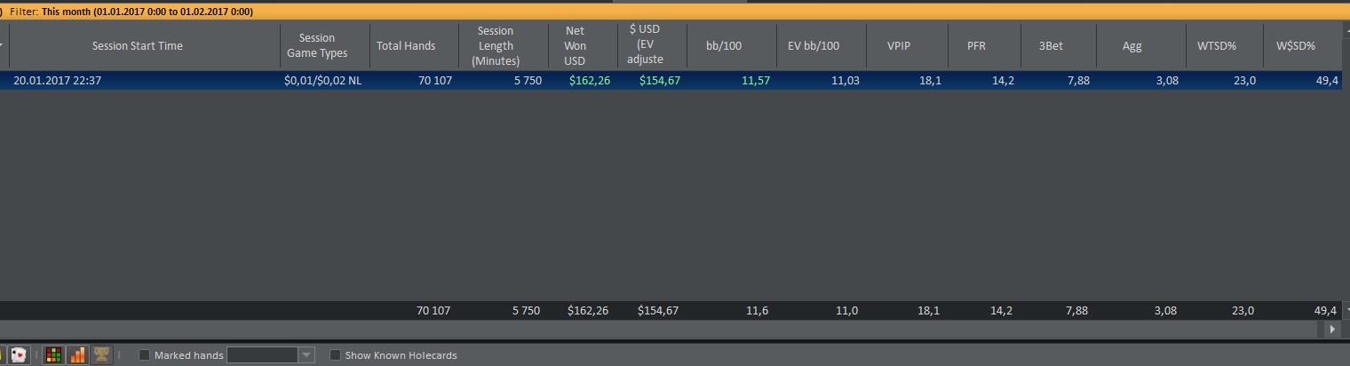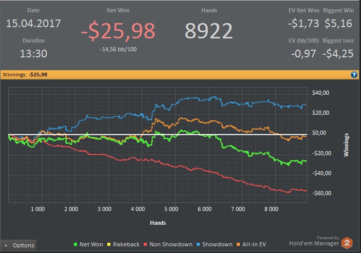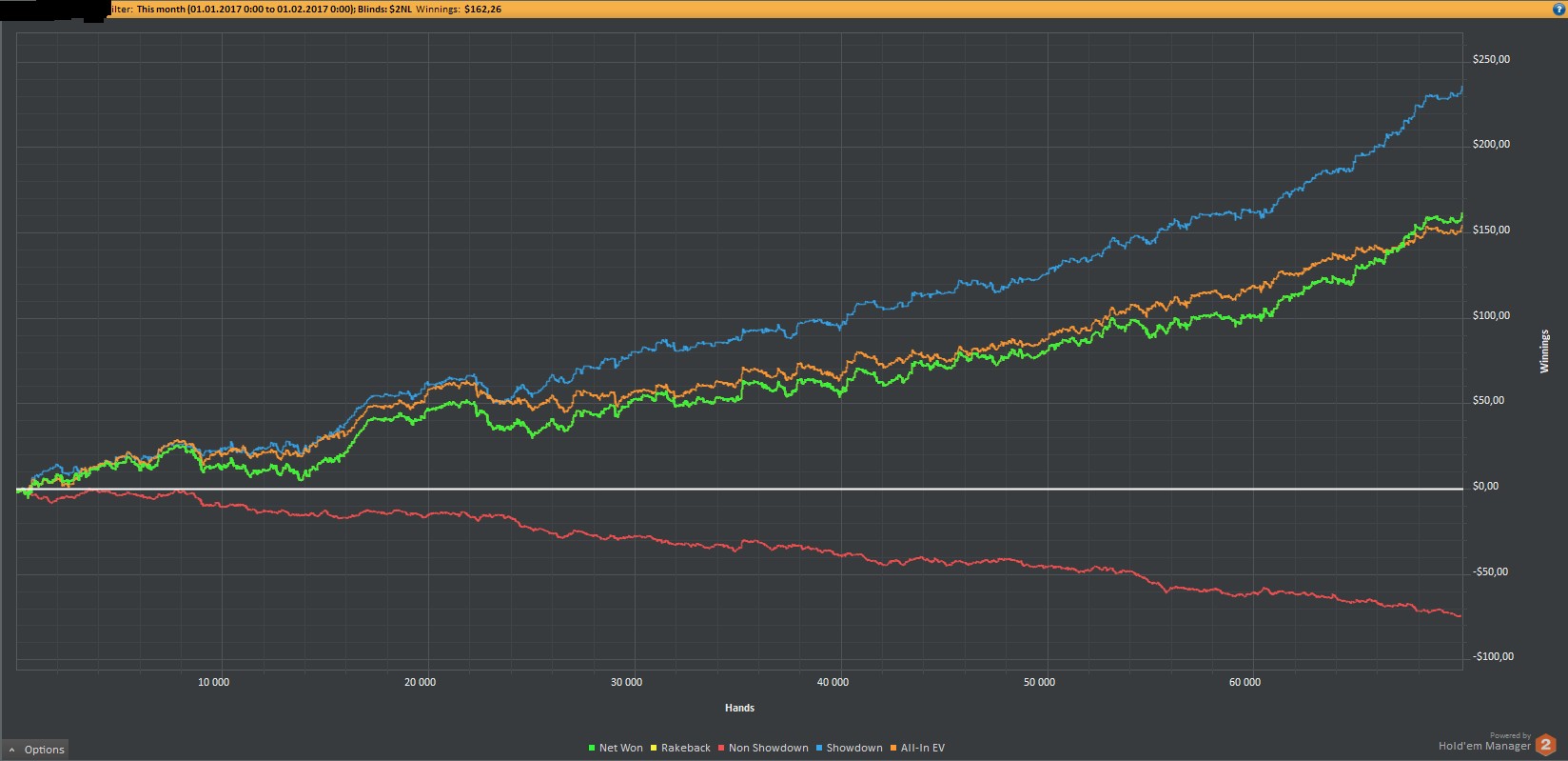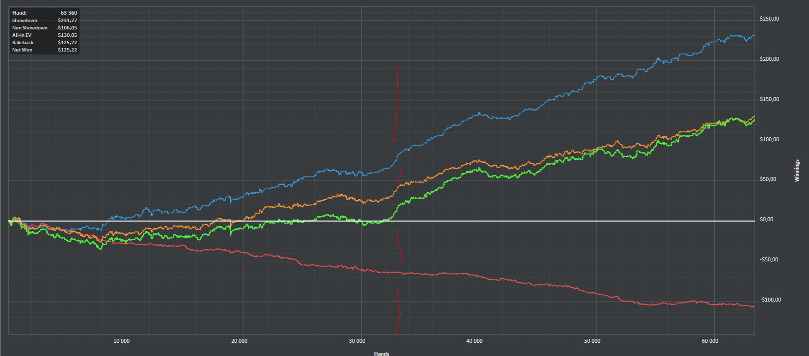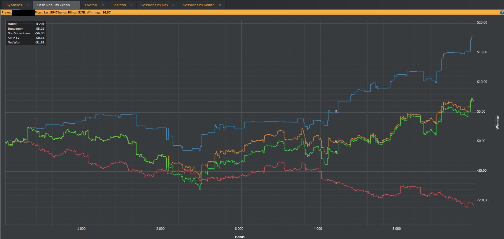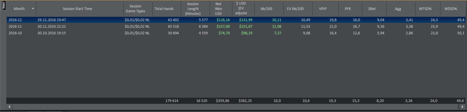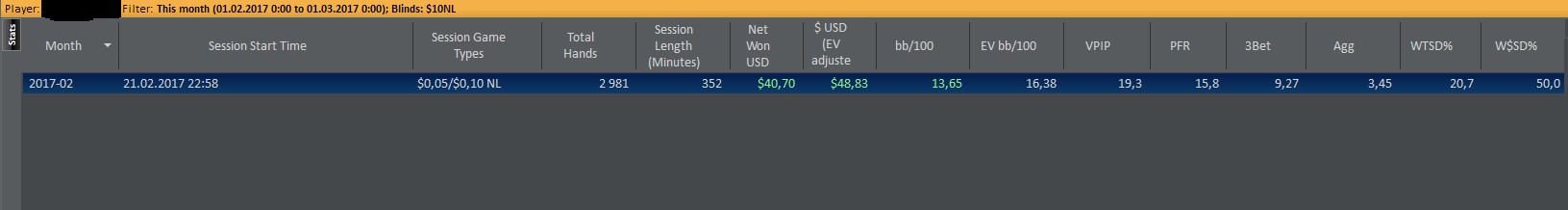 В целом мой покерный пусть можно разделить на несколько этапов. Этап №1 Октябрь 2016 деп 100$ игра на 15-ти столах без стат. Слив до 60-ти и тильт в котором пошёл на нл50-100 и переехал там парочку типов, что позволило зафиксировать кассу на 200$ Ноябрь 2016 скачан хм и поставлена цель зарабатывать покером и в диспе держать себя в руках и не ломиться на лимиты выше. Этап №2 Февраль 2016 вторая серьёзная диспа и моральный слом. Вывод бра в айпокер, игра нл5 в ноль месяц за 50$рб Возвращение на старзы с улучшенным скиллом и затащенным за 0.55 туриком, который отсрочил работу над игрой. Этап №3 Июль 2016 третья серьёзная диспа, игра в ноль 70к рук, возвращение передачи за эти полгода. С этого момента я начал разбирать базу и игру. Сентябрь-Октябрь 2016 рост винрейта на 2 единицы, но продолжение возвращения передачи. Первые шаги в бекинге, вновь разбор базы и вновь увеличение винрейта ещё на 3 единицы. Этап № 4 Ноябрь 2016-Февраль 2017 Игра с вр 10 и осознанием того, что это поле я бью стабильно. Бекинг плюсовый. Конец февраля 2017 Понимаю, что серьёзные деньги в бекинге поднимаются с увеличением бра поэтому штурм нл10 на хапок со слабой базой нл2 дна, как итог игра в ноль. Первый тильт в бекинге, серьёзный минус, боль.