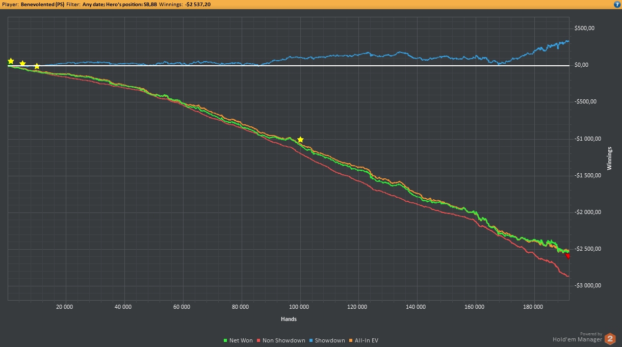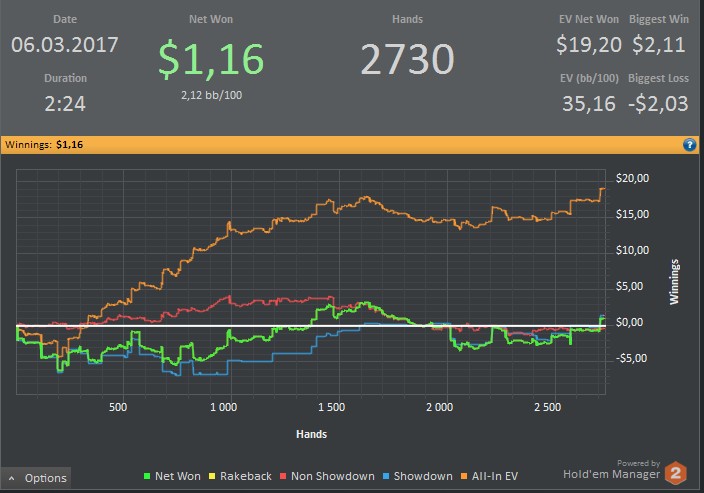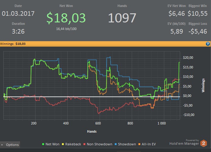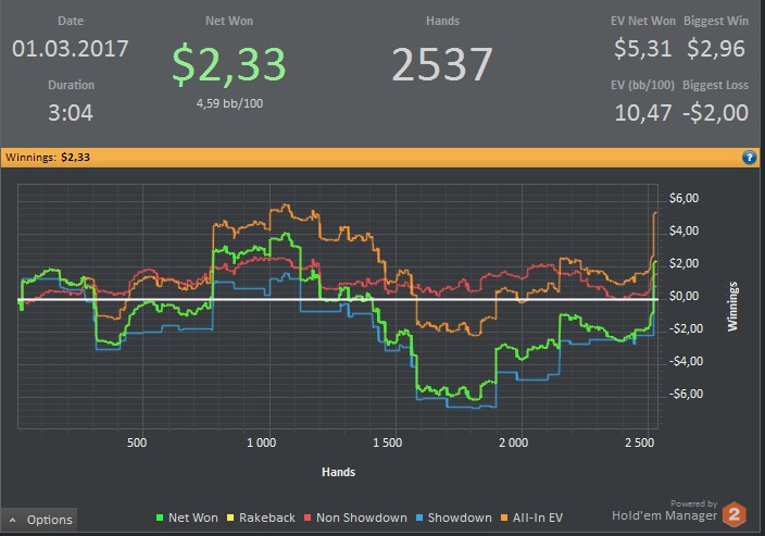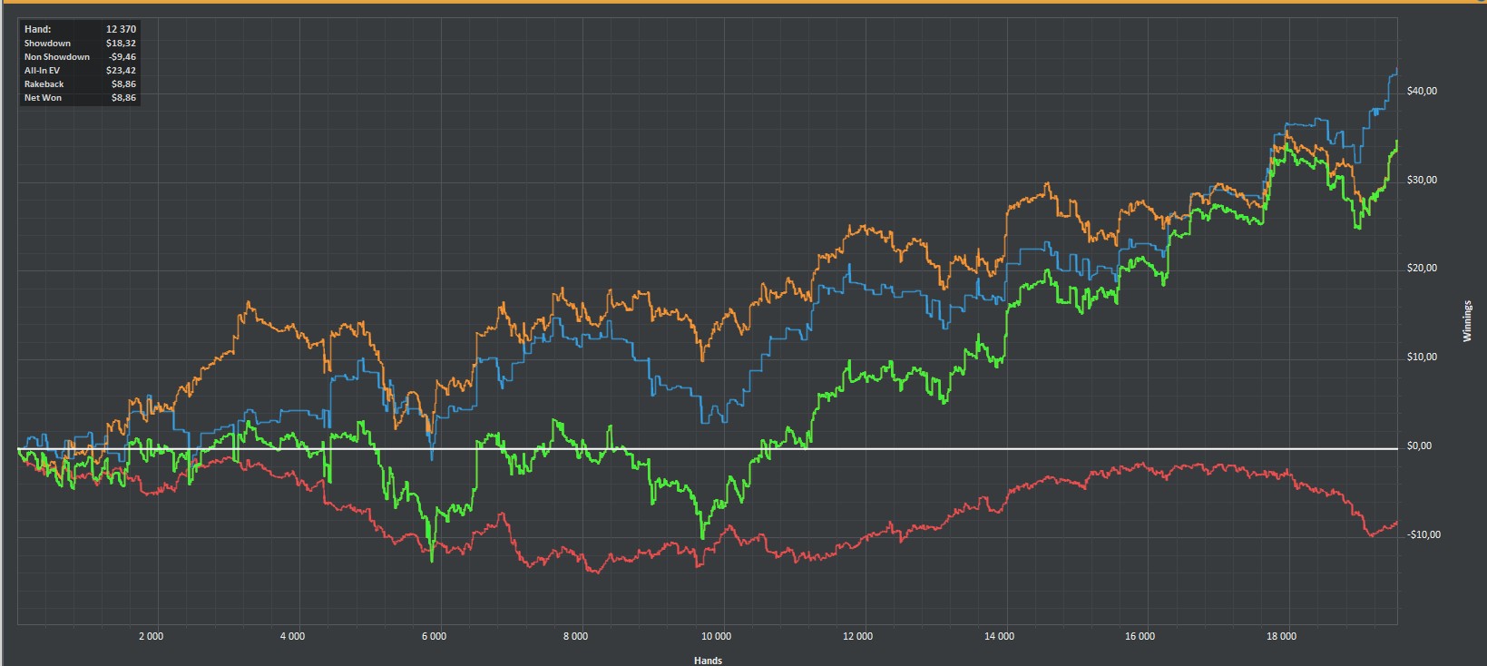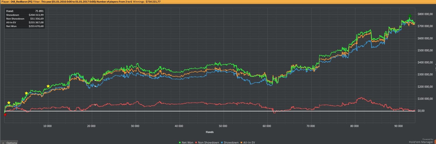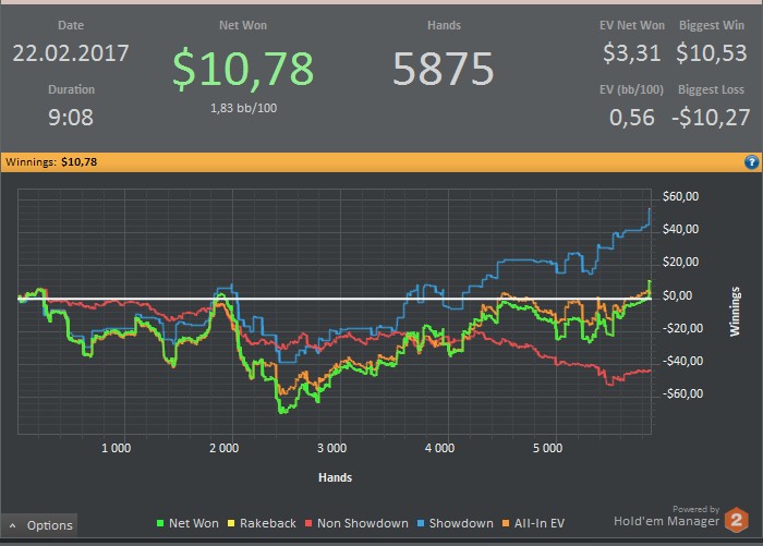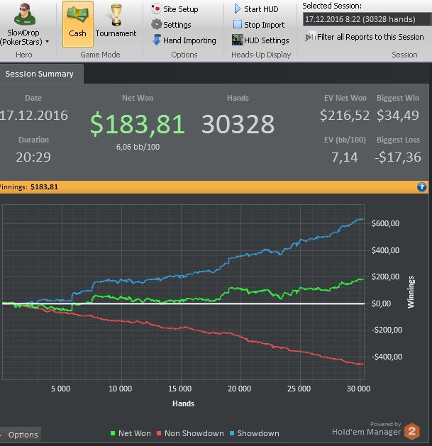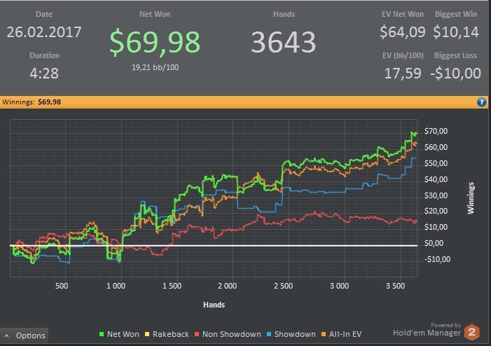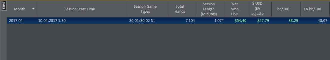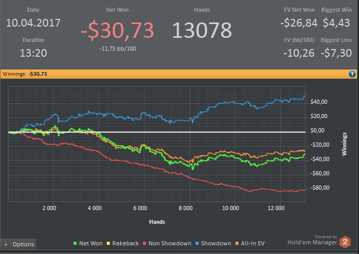 В целом мой покерный пусть можно разделить на несколько этапов. Этап №1 Октябрь 2016 деп 100$ игра на 15-ти столах без стат. Слив до 60-ти и тильт в котором пошёл на нл50-100 и переехал там парочку типов, что позволило зафиксировать кассу на 200$ Ноябрь 2016 скачан хм и поставлена цель зарабатывать покером и в диспе держать себя в руках и не ломиться на лимиты выше. Этап №2 Февраль 2016 вторая серьёзная диспа и моральный слом. Вывод бра в айпокер, игра нл5 в ноль месяц за 50$рб Возвращение на старзы с улучшенным скиллом и затащенным за 0.55 туриком, который отсрочил работу над игрой. Этап №3 Июль 2016 третья серьёзная диспа, игра в ноль 70к рук, возвращение передачи за эти полгода. С этого момента я начал разбирать базу и игру. Сентябрь-Октябрь 2016 рост винрейта на 2 единицы, но продолжение возвращения передачи. Первые шаги в бекинге, вновь разбор базы и вновь увеличение винрейта ещё на 3 единицы. Этап № 4 Ноябрь 2016-Февраль 2017 Игра с вр 10 и осознанием того, что это поле я бью стабильно. Бекинг плюсовый. Конец февраля 2017 Понимаю, что серьёзные деньги в бекинге поднимаются с увеличением бра поэтому штурм нл10 на хапок со слабой базой нл2 дна, как итог игра в ноль. Первый тильт в бекинге, серьёзный минус, боль.