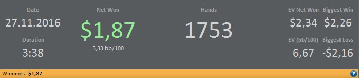 >>26255 >>29100 >>29116 > -29.62$ за 14785 раздач в декабре 2015 > -17.98$ за 14255 раздач в январе 2016 > -38.16$ за 40383 раздачи ещё раз в январе 2016 (жёсткий стрик) > -17.88$ за 14445 раздач в феврале 2016 > -33.79$ за 16536 раздач в мае 2016 > - 40.9$ за 52178 раздач в июле 2016 (жёсткий стрик) > -21.68$ за 16353 раздач в августе 2016 > -16.57$ за 18449 раздач за сентябрь 2016 +16.90$ за 18144 раздач в ноябре 2016