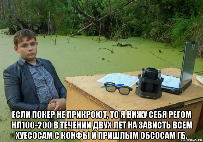 >>34445 >Какая смешная тема. По-моему, любой завод лучше вот этого вот. Но ведь любой работник завода пытается вырваться оттуда и становится очередным покорителем покера. Так забавно смотреть на этих хомячков играющих по 4 стола нл2 и так же забавно наблюдать, что через месяц на их место приходят новые хомячки, а старые в тильте закатывают банкроллы и появляются в бекинге, но чаще в кривой миной возвращаются на завод и не выёбываются.