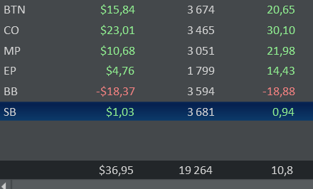 В-общем кажется более менее отпустило и может к концу месяца если проёбываться особо не буду, то винрейт будет норм. Добавил 9 интересных стат, которые позволяют больше пиздить банков. Пришлось ради этого даже второй попап сделать потому что когда по общему начинаешь их искать, то хуй найдёшь. Ещё хочу сказать, что немного удивлён в том плане, что много хорошо плюсовых регов на которых показывает от 15бб имеют агру по улицам 2 1 1, 1 1 1, 3 2 2, 2 2 2 Почти не агрессивные и сильно плюсовые. Странно. Вообще давно хотел купить майнинг на 3-4х регуляров, чтобы посмотреть реальный винрейт, а не тот, который показывает хм2. Просто интересно каждый ли месяц они имеют такой профит или чуть меньше. Посоны, а в частности мои верные наставники и благодетели, выделите нищему обиженке 20$ на покупку майнига или купите сами и слейте сюда, позязя :3 Бр 126 и при 150 начинаю шотать по столу нл5 На бре в 250 полностью перехожу на нл5 4-6 столов. Такие дела.