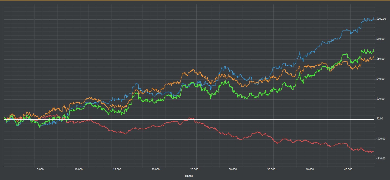 >>34417 У тебя кстати дистанция ещё довольно маленькая на нл10 всего 180к рук так, что такой жёсткой диспы ты ещё не видел. Калькулятор этот можно выкинуть в унитаз потому что такая уничтожающая диспа наступала ровно на 300-450к раздач и когда я играл в 3бб и сейчас, когда играю 10бб. Мне кажется здесь банальная математическая вероятность получить такой стрик просто если винрейт выше, то и вероятность ниже, но она есть. И вообще справедливости ради хочу сказать, что я не залил 40$ на анте столах поднял же 64 с вр 30бб и ебануло меня на 40. Так что игра в ноль,но мне это не нравится.