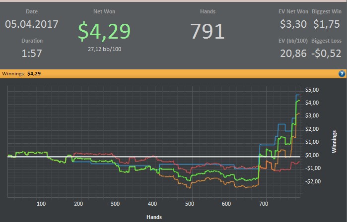 Как видно по этапам после каждого раза, когда я опиздюливался в игре и терял/не зарабатывал деньги, то брался за свою дисциплину, что приводило меня к успеху. Уже совсем скоро возьму паузу на 1-2 недели, буду разбирать базу, анализировать все пакеты в бекинге. Всё зависит от моей дисциплины, которая улучшается только когда я страдаю. Этап №5 Май 2017 Стартовые 70$ довожу до 200 и иду на нл5. Постараюсь в этот раз всё-таки работать в эквилабе и почаще разбирать раздачи.