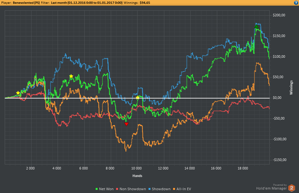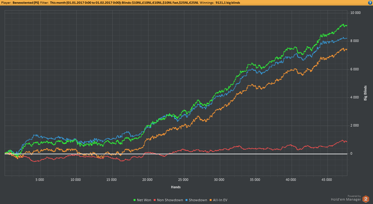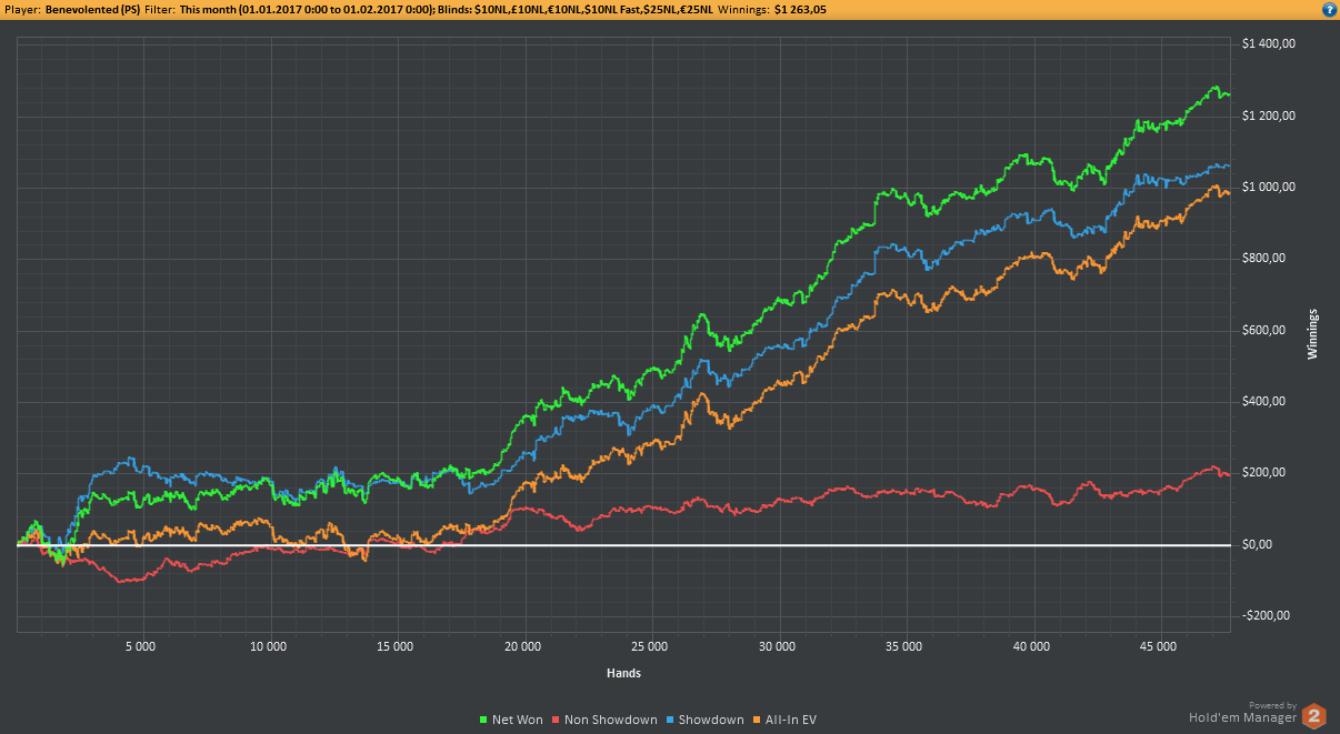 Алсо, самый плохой месяц за всё время пришёлся на декабрь. С рейкбеком $132 ^_^ На пике 2 весь мой нл10, с которым я надеюсь в скором времени распрощаться. Результаты, мягко говоря, не очень, но игра меняется потихоньку. Как всегда не хватает дисциплины и моральных сил. После того месяца, когда меня уебали на нл25, мне просто стрёмно играть. Моя А-игра стала в разы лучше, моя С-игра на несколько порядков хуже. Животный рейдж.