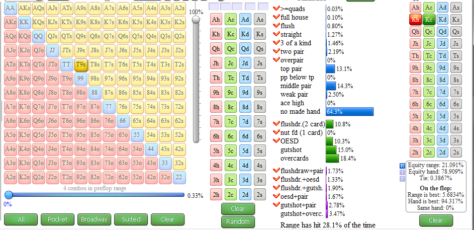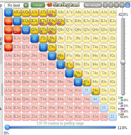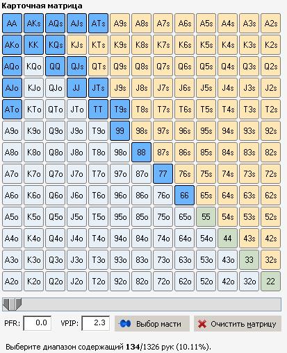 Пацаны, нюфаг чутка вкатится, если вы не против. Начал дрючить вильямса "бьем микролимиты". Чутка конспектирую книгу, лол. Ну что для меня очевидно, не пишу, а выбираю только то, что не знаю. Он выдвигает тезис, мол есть олени, которые префлопрейзят только с АА,КК,QQ,АК, что является 2% рук. Я тут посчитал, что это 34 руки. Всего нагуглил, что 1326 рук бывает. Выходит, что натан наебался на полпроцента, т.к. это 2.5%. Но это хуй с ним. Я тут в эквилабе накидал то, с чем я рейзю. Зацените, что-ли. А то там советуют около 12 пфр держать, ну т.е. 12 процентов рук рейзить. Хому пока не установил, т.к. учусь, да и комп у меня слабый. Про позу пока загоняться не буду, допустим сижу отбываю я где-нибудь в поздних позициях, допустим последние 5 позиций.. Эквилаб выдает, что это 10% всех рук, какие еще 2% добавить, а может наоборот какие руки убрать?