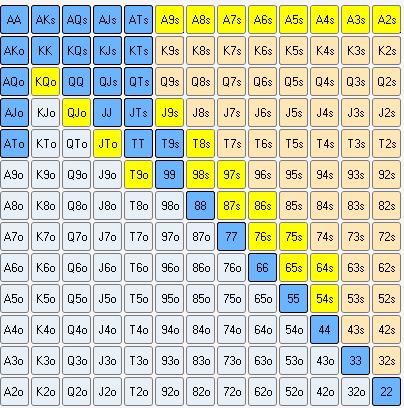 Играй понятные тебе сильные руки с которыми не возникает тяжелых решений постфлоп. Практикуйся на плеймани, чтобы составить подходящий именно тебе чарт, если нет денег заливать на нл2.
