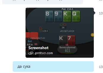 http://www.handconverter.com/hands/3008576 Опп удивил. У него высокий фолд на 4бет, поэтому я почти никогда не ожидаю эту руку, ну ладно. Но меня больше интересует его логика, когда он на четверть стека коллит её ооп. Он планирует меня переиграть? Допустим. Всего за борд он зацепится в 28% случаев. Руку лучше моей он получит в 6% случаев, когда будет выставляться по флопу. В 43% он будет тянуть её в минус при ужасном СПРе, где по тёрну на большинстве бланков я буду просто пушить. Конечно мне ничего не остаётся как запушить КК в этот мерзкий сетап. Оба рита я выиграл, кстати, две дамы вышли, но мне от этого ни холодно, ни жарко, старзы уёбки. Поймал свои 6% и пусть идёт нахуй.
