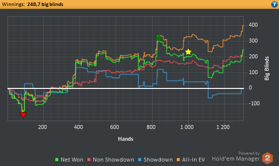 Во второй раздаче должен быть лёгкий фолд. 2% трибет за 250 рук, орущий сайзинг, но я с лёгкостью кладу фиша на эниту и пушу. Потом всегда себе говорю - чувак, здесь был простейший фолд, будут споты менее граничные. Но всё равно пушу. В первой я банально не добрал с блефов, будучи в позе. Конечно, флоп с А или Q видеть не очень приятно, но на дистанции у меня колл КК против пуша в очень выгодном свете стоит, хотя на блинах сойдёт.