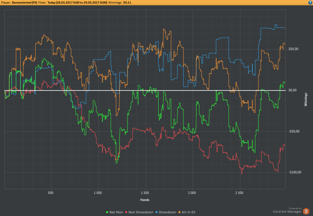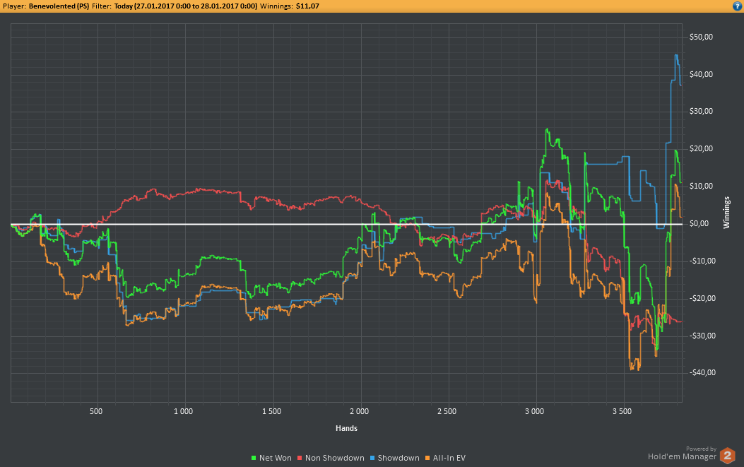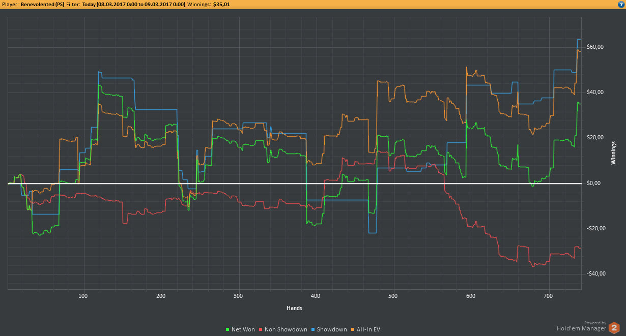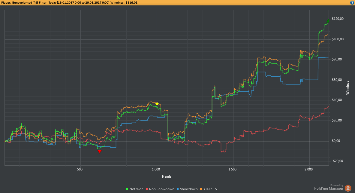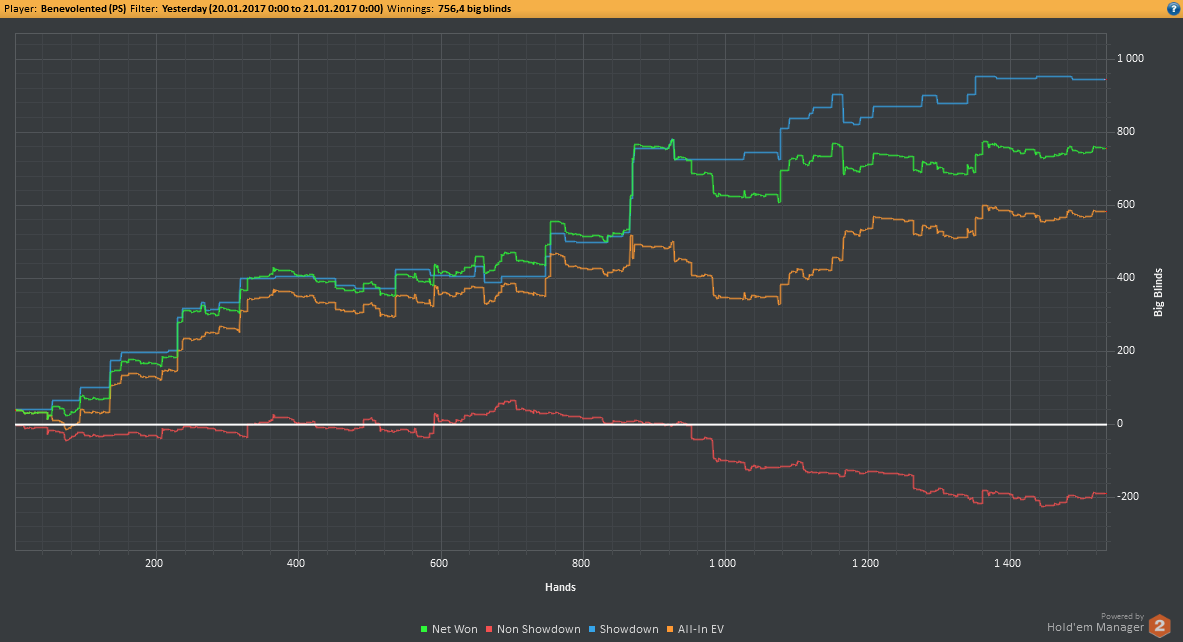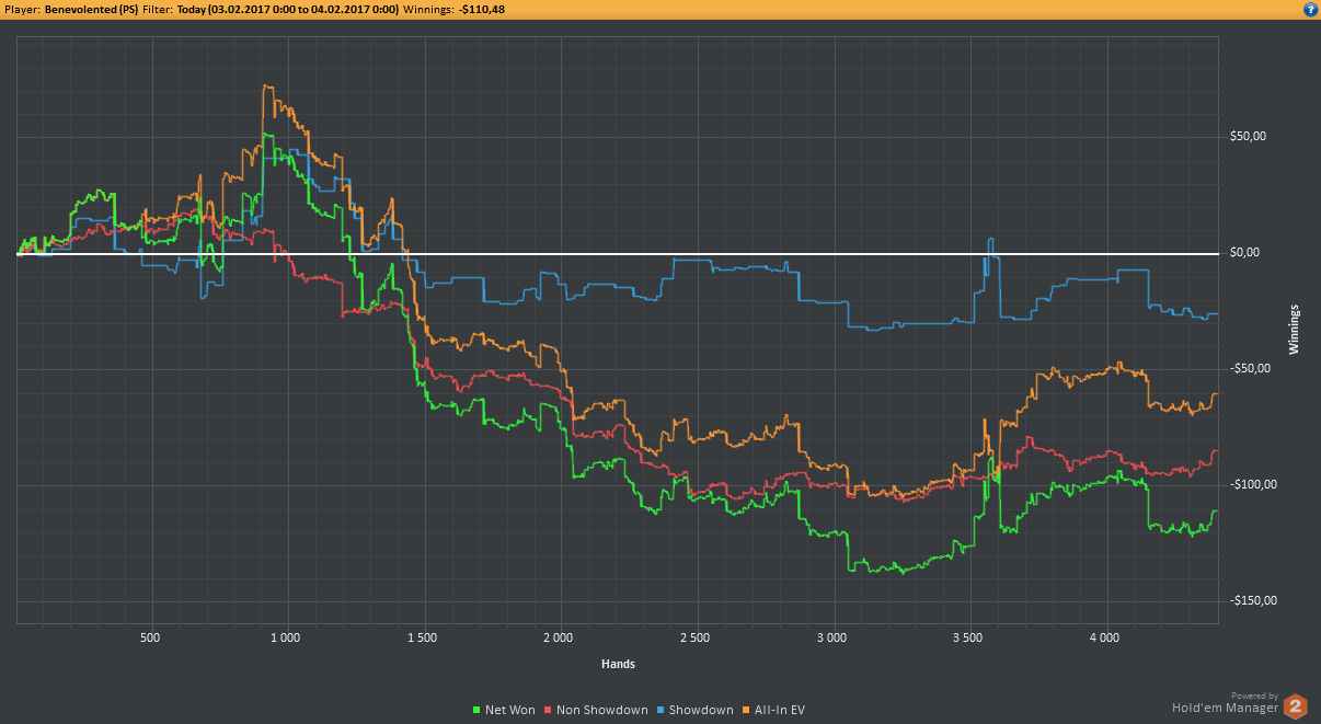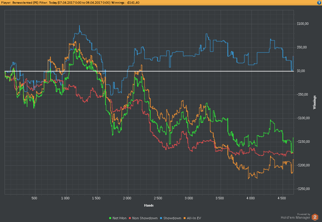 Вчера оформил худшую сессию, сегодня лучшую. Как же меня ебали первые 2к рук! Мне плакать хотелось от своих оверфолдов, постоянных сплитов, доездов 1%-х! Ебучие раннер-раннеры всюду. Профит должен быть минимум в полтора раза больше, это был ебучий даунстрик и у меня до сих пор бомбит от того пиздеца that made my eyes and ass bleed. Алсо, это самая длинная сессия за последние несколько месяцев, и это радует меня даже больше, чем деньги, которые я завтра так же залью. Я хочу снова гриндить.