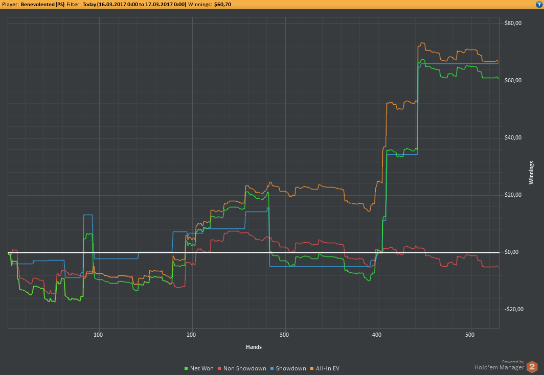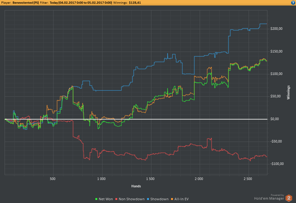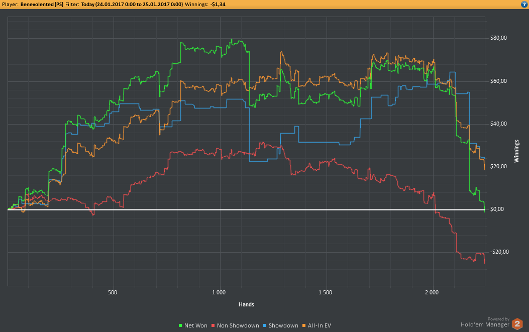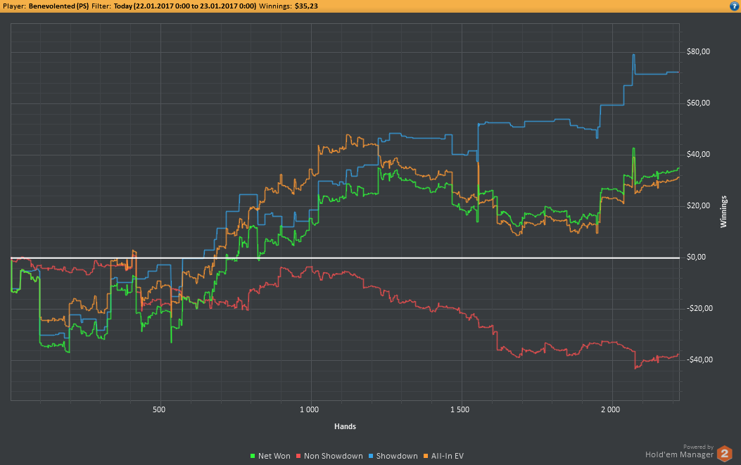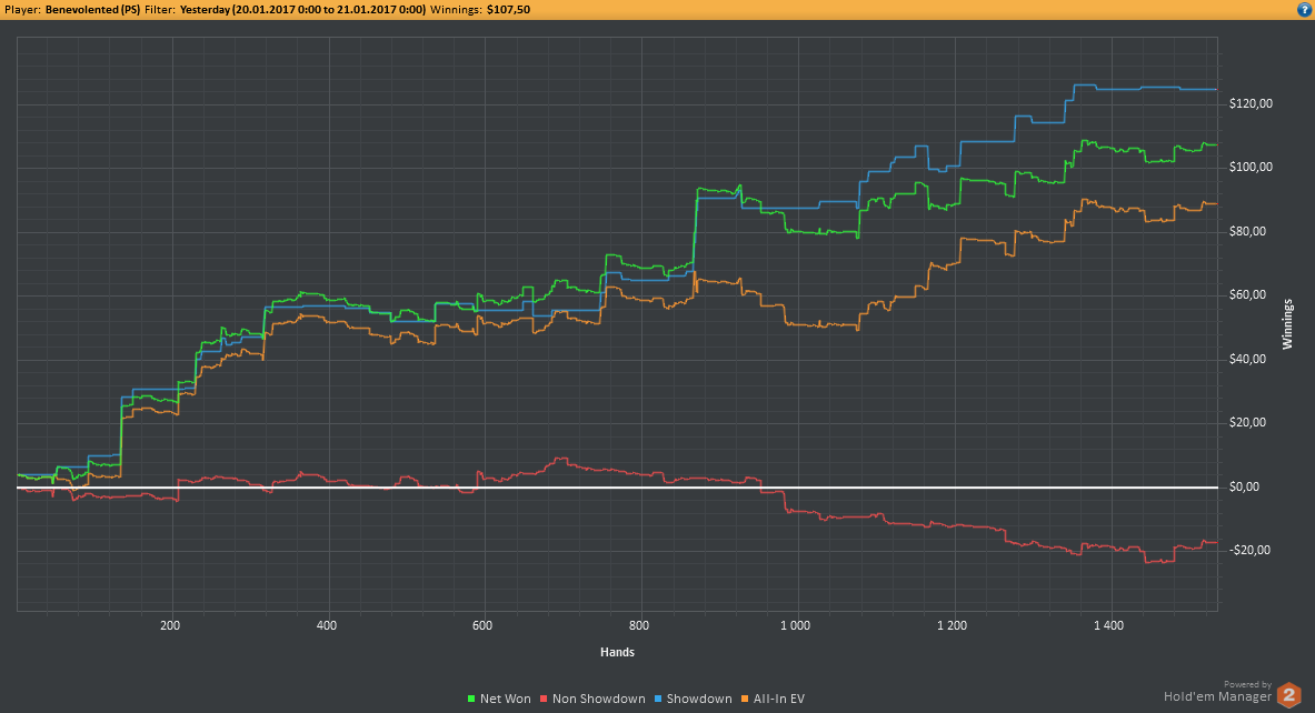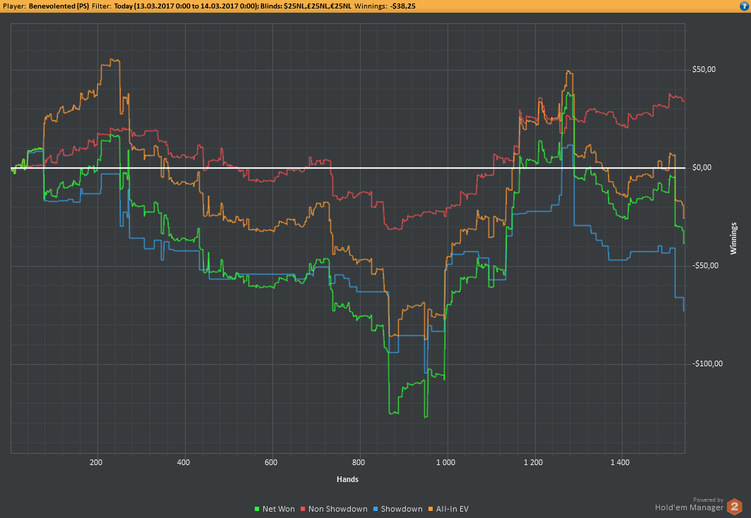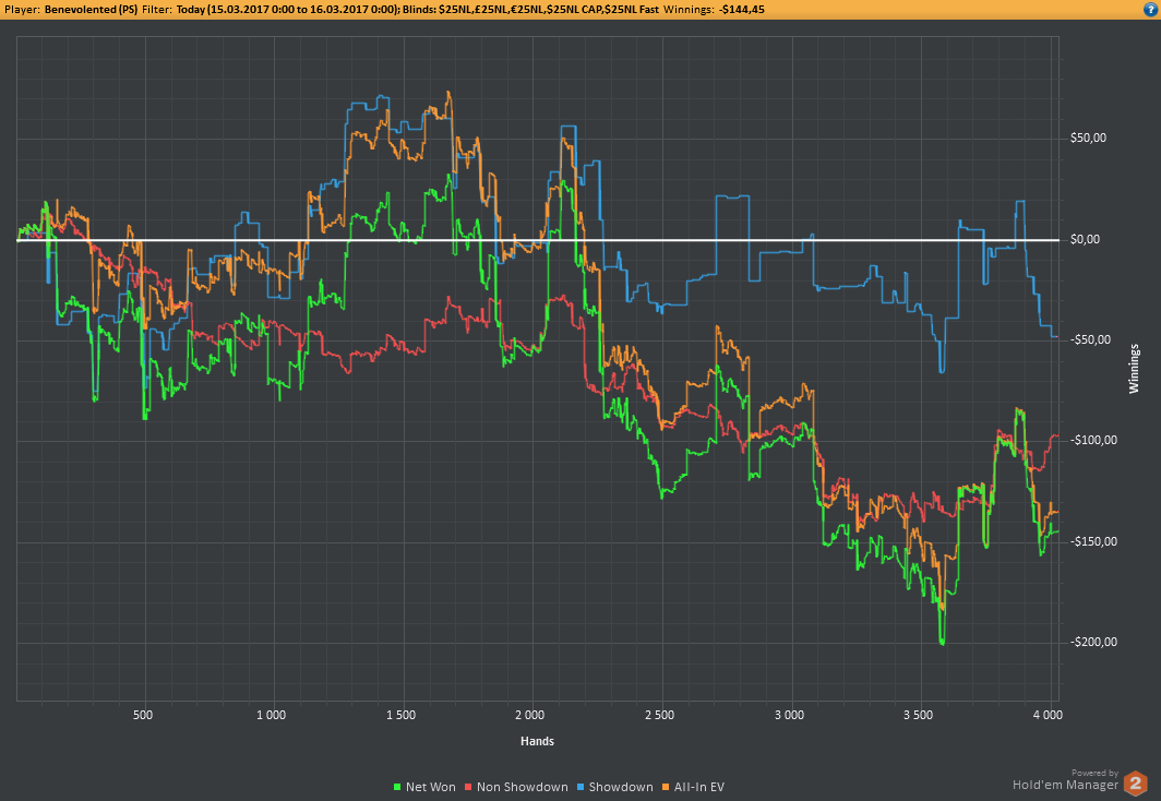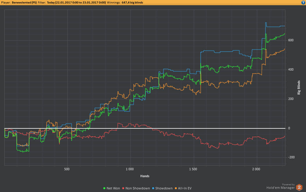 Вчера оформил худшую сессию, сегодня лучшую. Как же меня ебали первые 2к рук! Мне плакать хотелось от своих оверфолдов, постоянных сплитов, доездов 1%-х! Ебучие раннер-раннеры всюду. Профит должен быть минимум в полтора раза больше, это был ебучий даунстрик и у меня до сих пор бомбит от того пиздеца that made my eyes and ass bleed. Алсо, это самая длинная сессия за последние несколько месяцев, и это радует меня даже больше, чем деньги, которые я завтра так же залью. Я хочу снова гриндить.