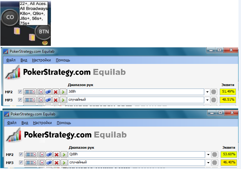 Пацаны, плеймани-даун опять вкатился. 2 месяца был сломан комп, но это и заебись, забыл, как играл на автомате собою придуманные чарты, сейчас задрачиваю "бьем микролимиты" и буду играть, как надо, а то переучиваться хуже, чем учиться с нуля. Собственно суть вопроса, из позиции катофа предлагают разыгрывать Q9о+ и J8о+, но в то же время не предлагают разыгрывать Q8о, а ведь у нее эквити больше, чем у J8о. Где логика и что я упустил?