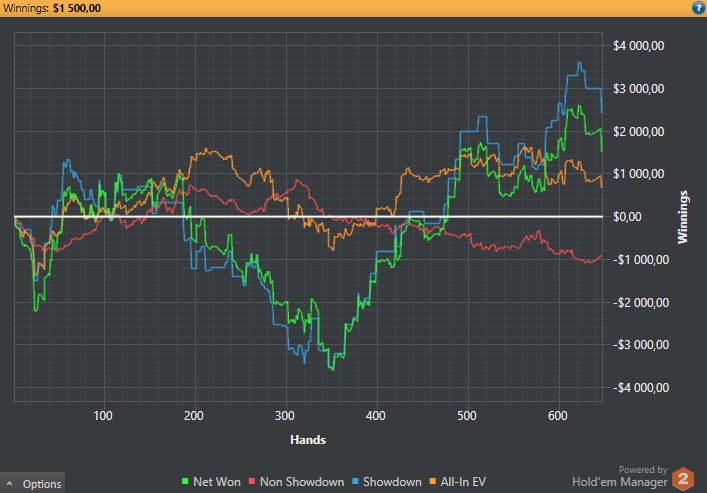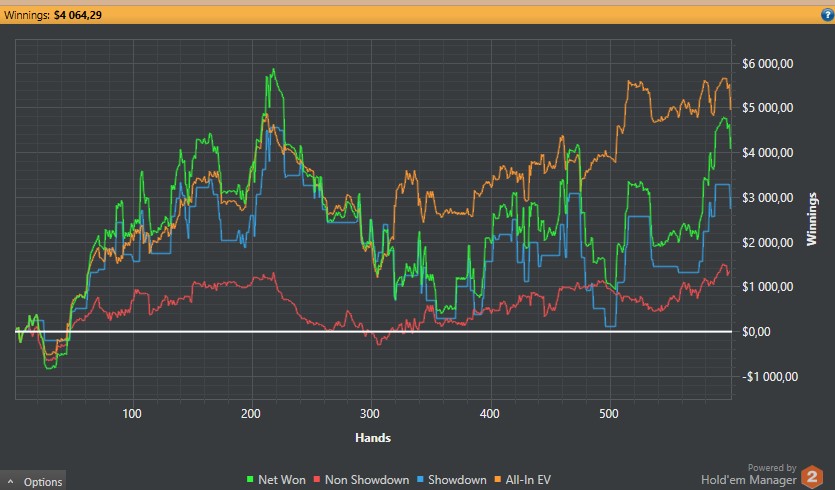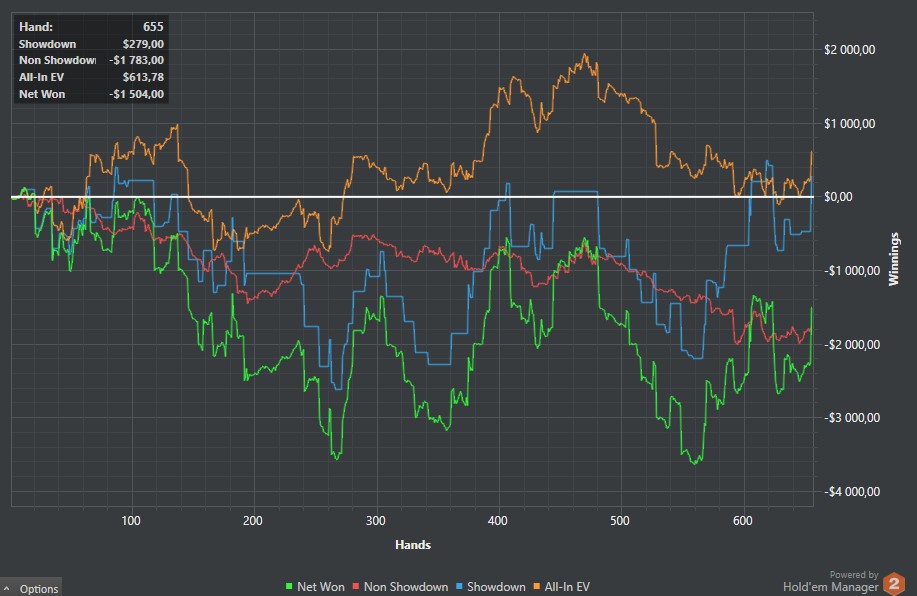 Отыграл 30 туриков, хотя мне казалось, что больше. Судя по хму, заняло времени суммарно 4 часа. График можете видеть. По ощущениям - пиздец какой-то - очень не привычно. Статы у меня конские вышли. Это впип и пфр на 2 пикче. Много бомбил на эни ту префлоп рейзами в нитов. Первый пфр с СБ тоже на эни ту делал с целью оценить оппа, проставлял многие флопы, подходящие на мой взгляд. Изолейтил очень лузово для инфы ещё... Если честно, чувствую себя фишом, но поляну гораздо большими фишами ощущаю. Господи, какие же там обрыганы играют, хотя это не удивительно, конечно. Хотя и относительно адекватные встречались. По ходу сессии обозначил главные непонятности: