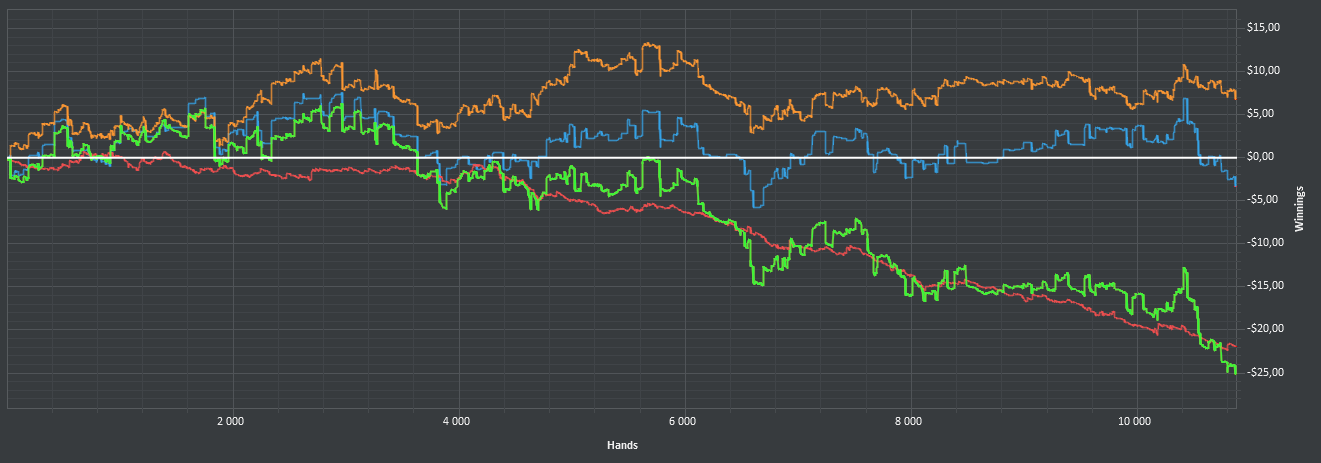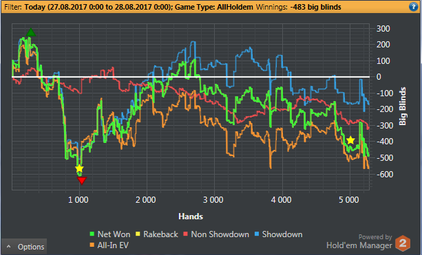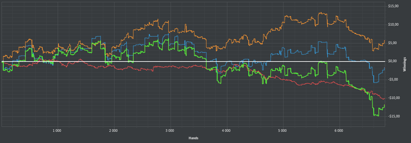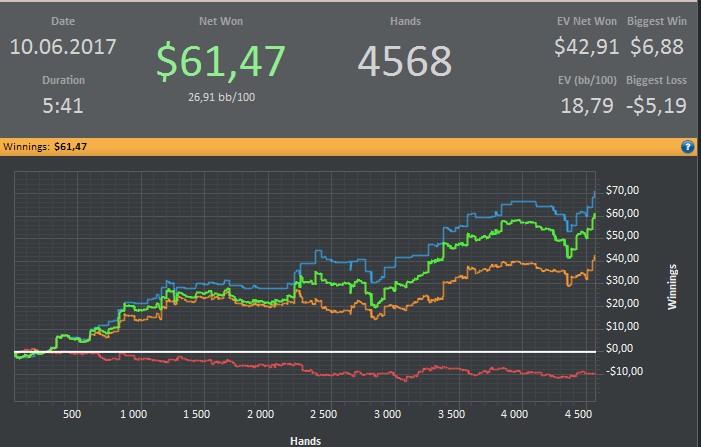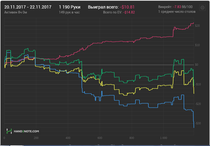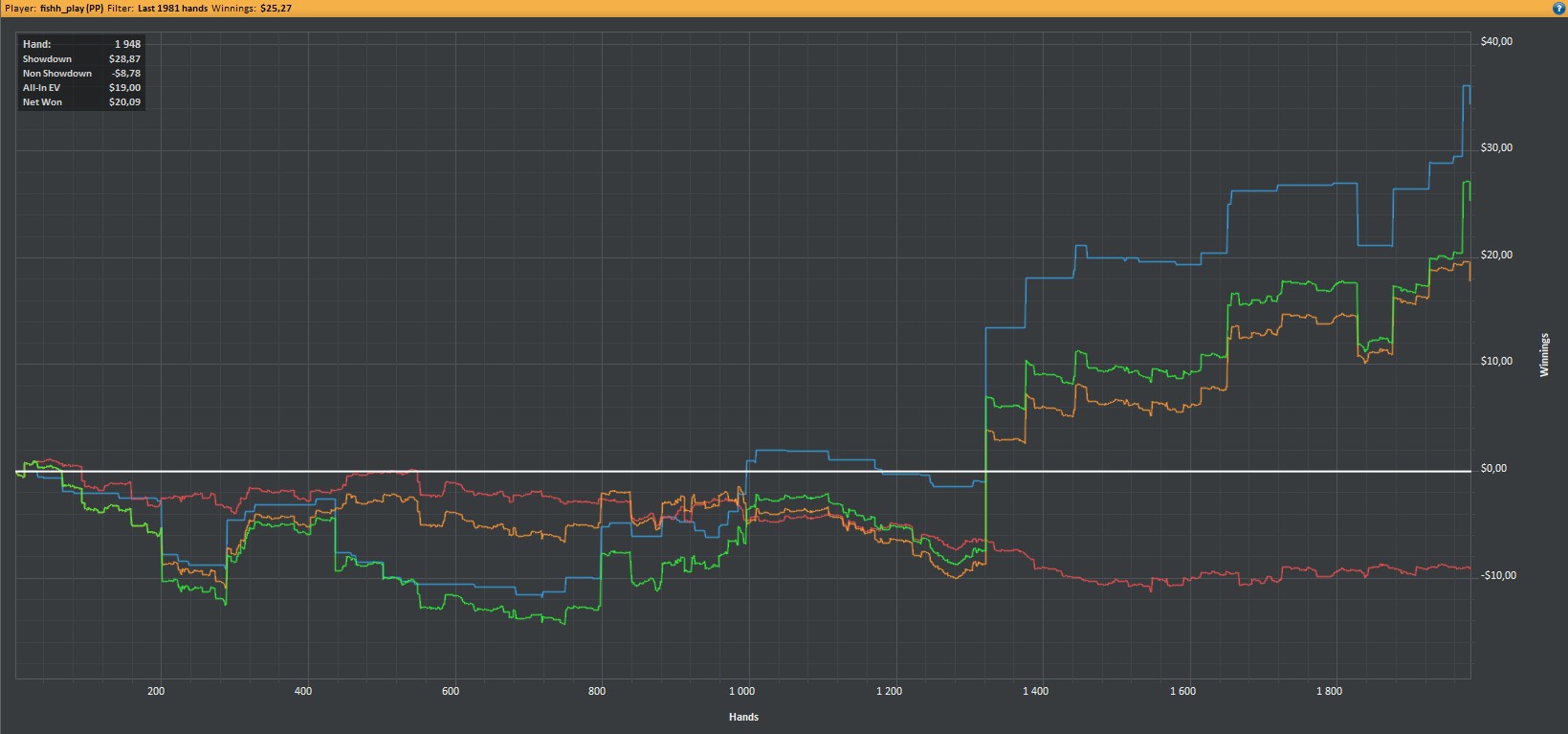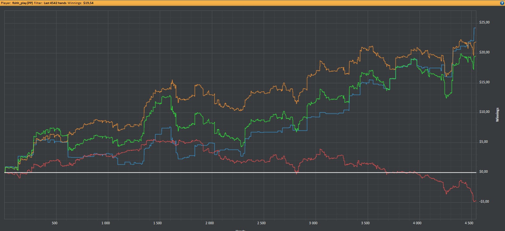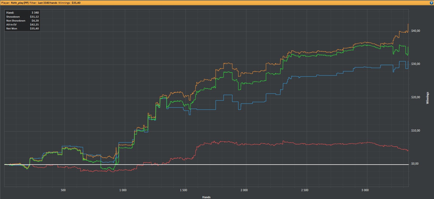 После 3000 руки начались сильные волнения - то результат моей динамики с эпичным фишем со vpip и pfr в районе 50. Я сидел в позе на него и все равно умудрился отдать деньги, лол. Из-за него же сговнил ев линию, а от неё я возбуждаюсь больше, чем от зеленой. В итоге фиш срулил с деньгами, козел!, а я успокоился и продолжил катать авс покер. Разобрался с худом -- что означают основные статы и все такое. До сего дня он просто висел и не вызывал моего интереса. Классная штука, не стоило пренебрегать. Разбор рук зря отложил, сейчас их стало ещё больше. Завтра займусь и скину итт.
