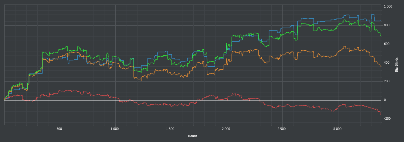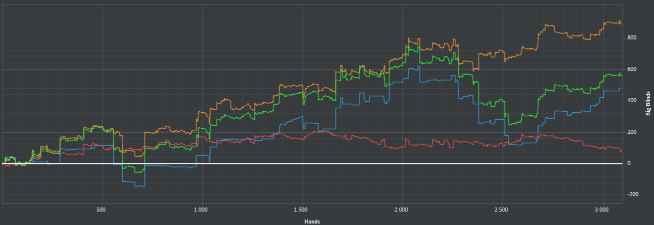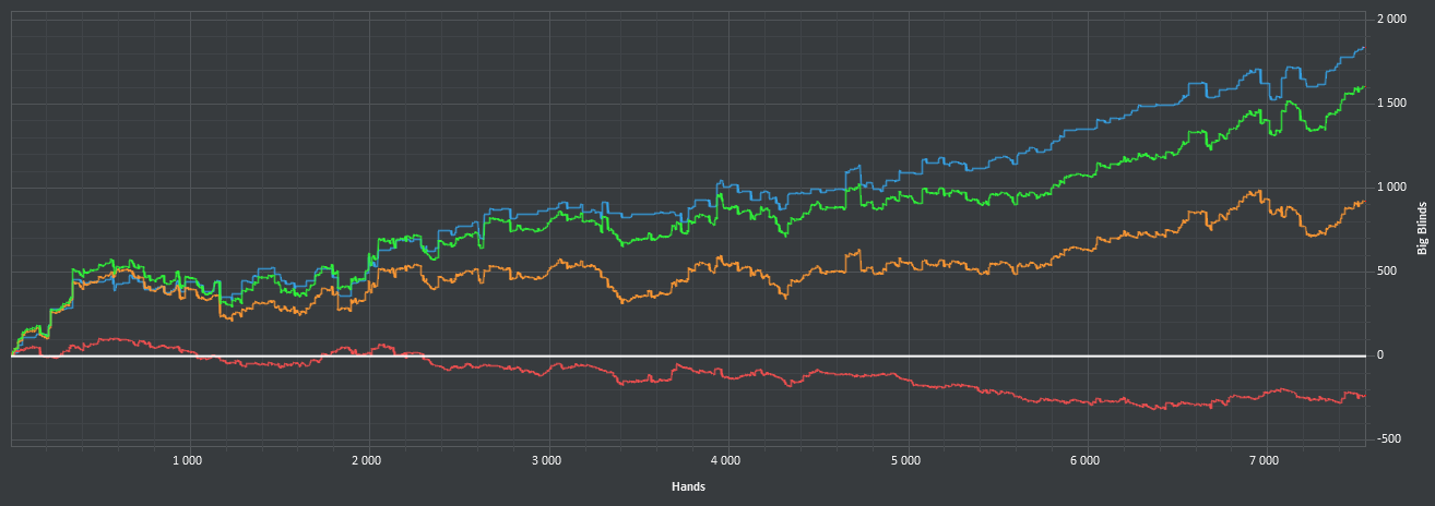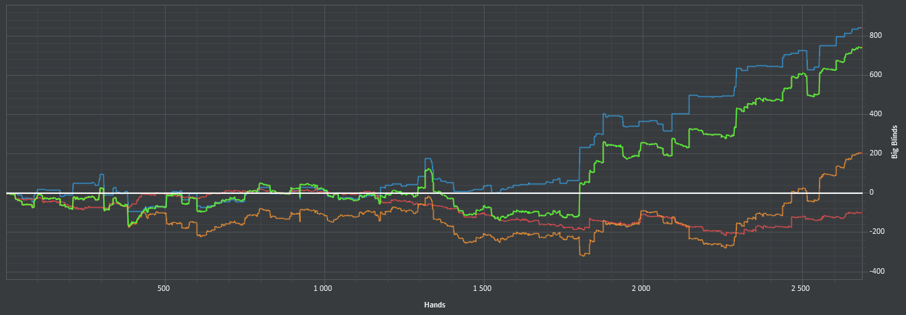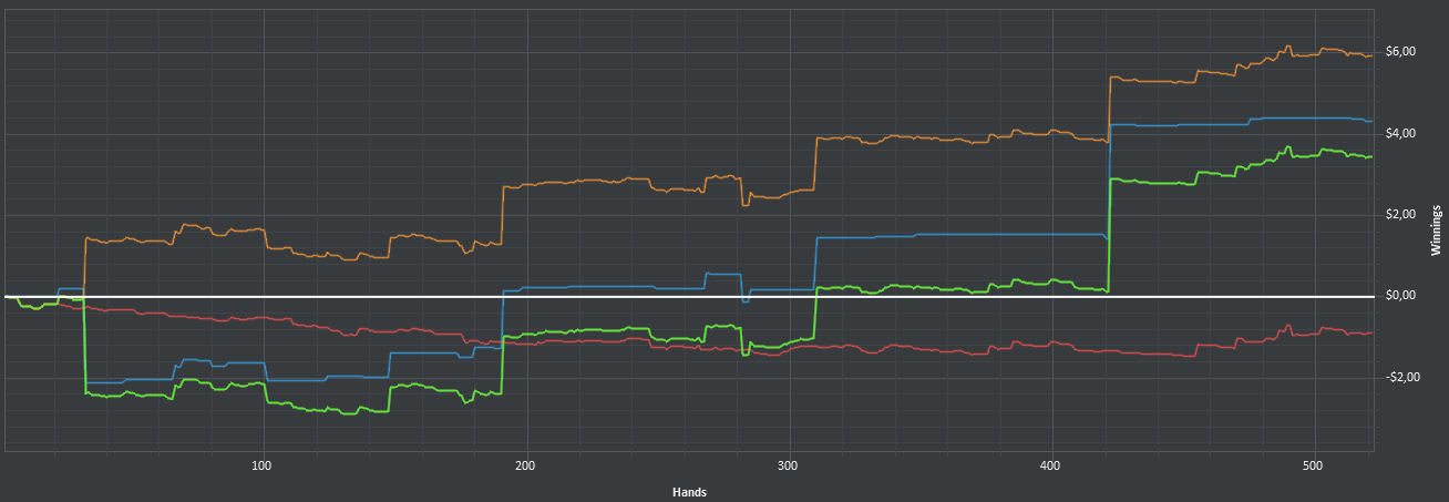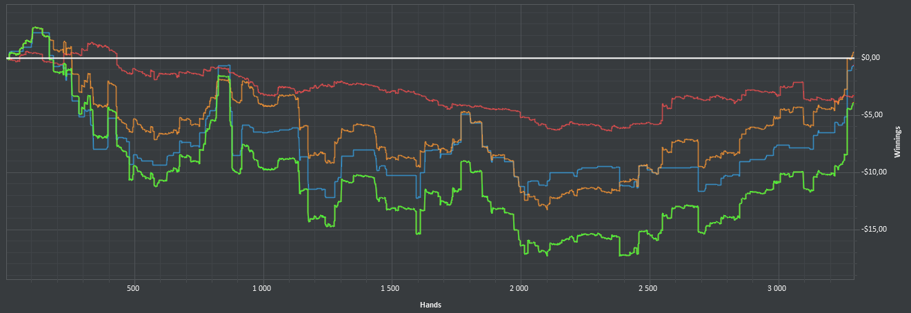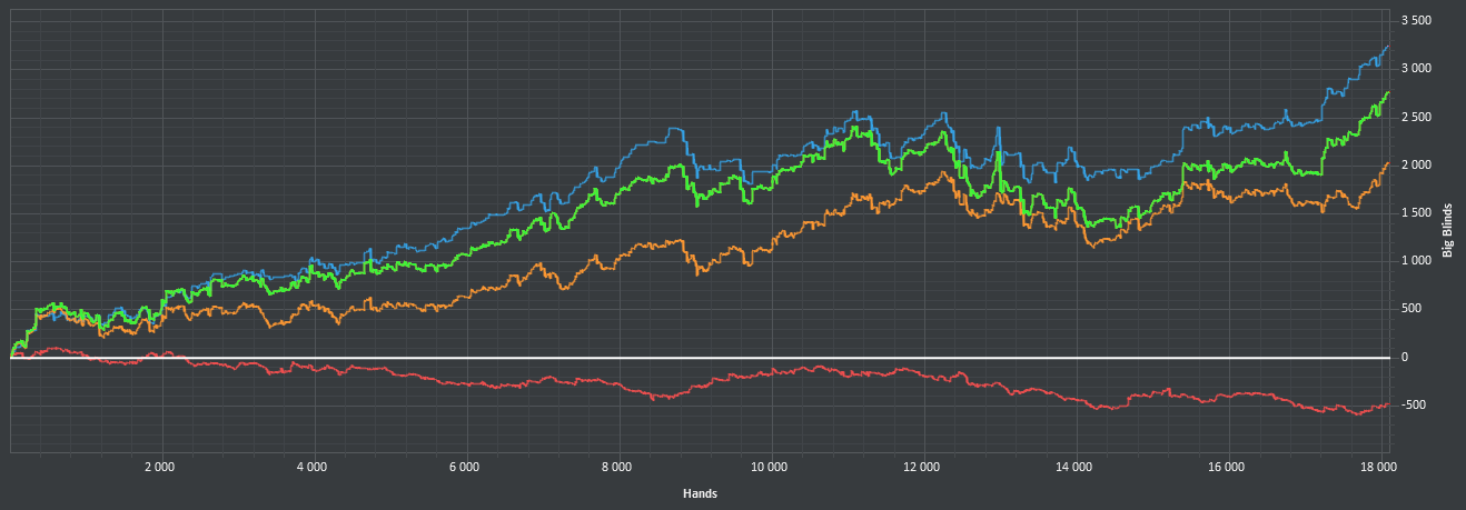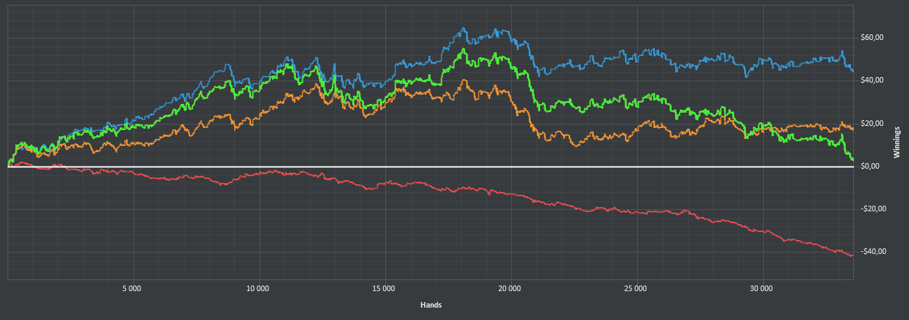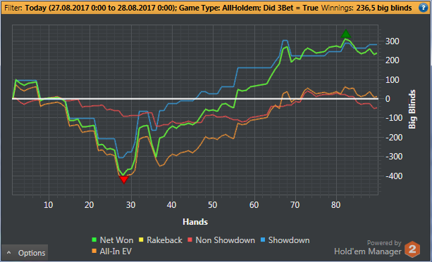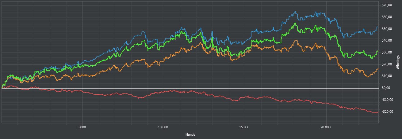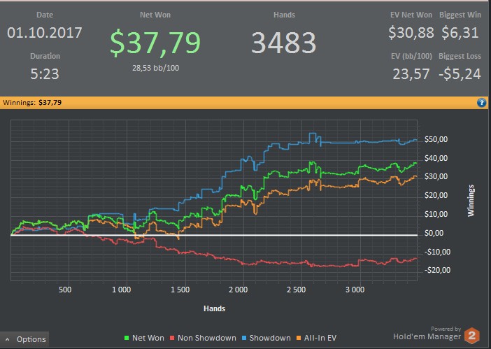 После 3000 руки начались сильные волнения - то результат моей динамики с эпичным фишем со vpip и pfr в районе 50. Я сидел в позе на него и все равно умудрился отдать деньги, лол. Из-за него же сговнил ев линию, а от неё я возбуждаюсь больше, чем от зеленой. В итоге фиш срулил с деньгами, козел!, а я успокоился и продолжил катать авс покер. Разобрался с худом -- что означают основные статы и все такое. До сего дня он просто висел и не вызывал моего интереса. Классная штука, не стоило пренебрегать. Разбор рук зря отложил, сейчас их стало ещё больше. Завтра займусь и скину итт.