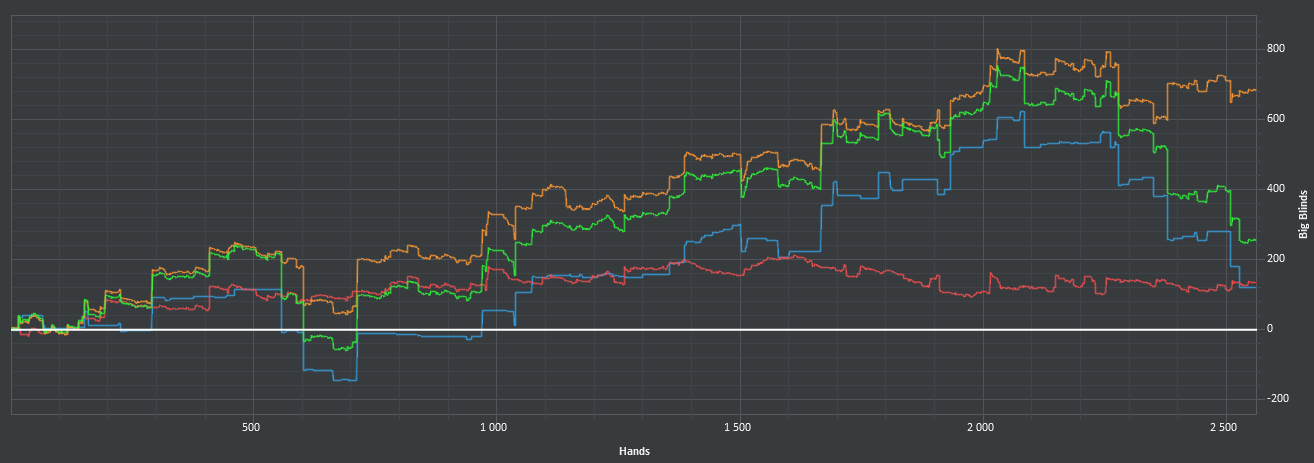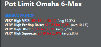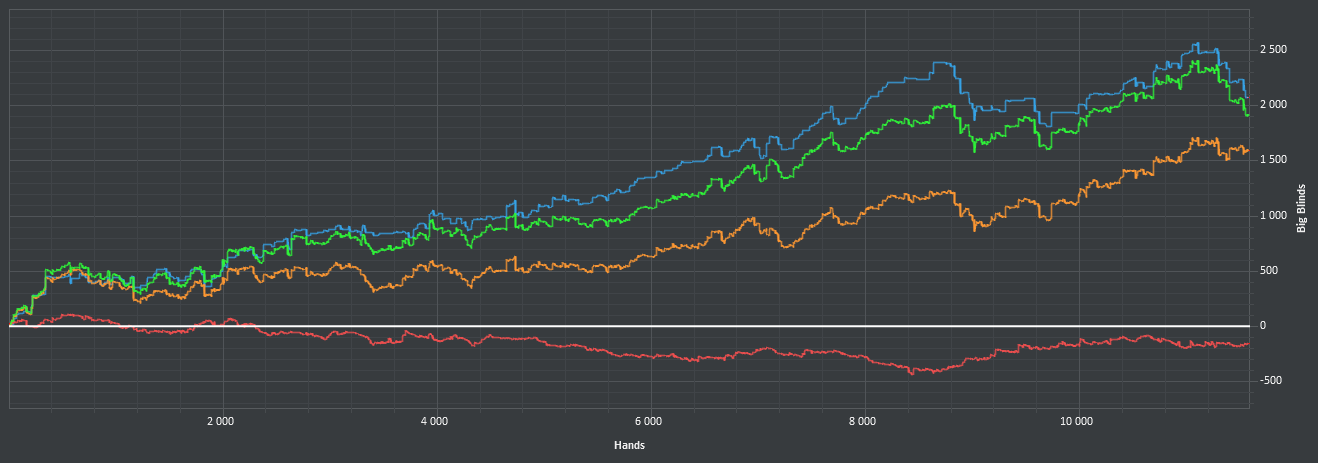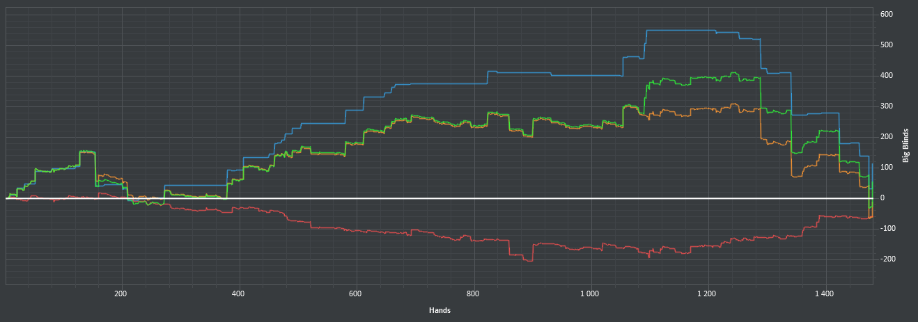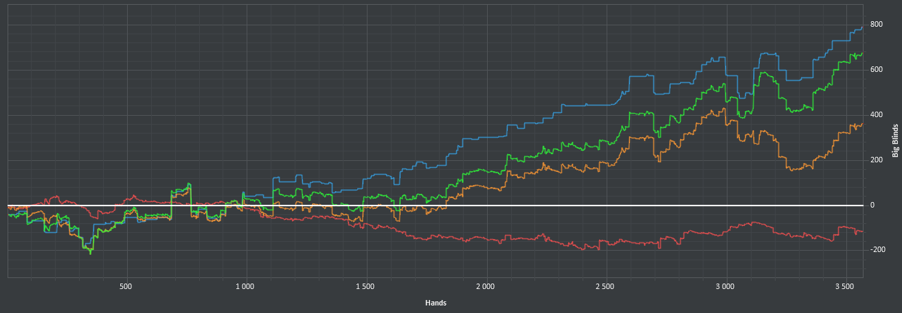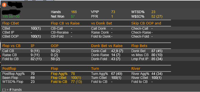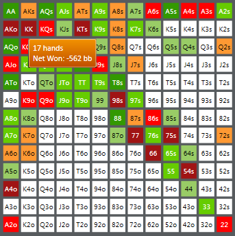 Заинтересовался блефами и балансом - игрой от своего ренджа. Но за столом пока не представляется возможным распределять диапазон по текстуре борда, потому что я эти свои диапазоны даже не знаю и подсматриваю скрины во время игры. Так что тупо поливал бетами с блокерами и всем, что имеет эквити, перекос на лицо. Раздачи потом поскидываю мб