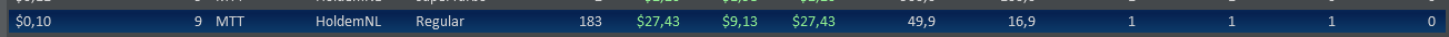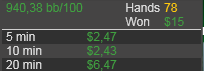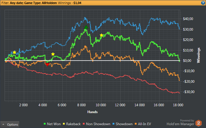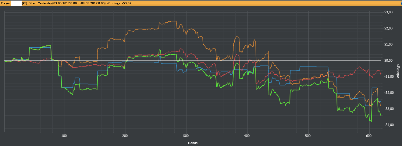 Нет поводов для радости. Первого получил 6$ за место в таблице Elementary League. Пикрил мои потуги в следующие 2 дня Вчера, начиная примерно с 300 руки, испробовал последний шанс: фишовая игра со впипом 80. Дистанция в 350 рук это ничто, но я натурально охуел, насколько вышло минусово. Только ЕВ зря на 2,5 стека опустил. Вообще, такой широкий спектр могу себе позволить только на баттоне - открываюсь минрейзом и основные надежды возлагаю на фолд эквити - задешево и без боя спиздить блайнды. На последний доллар сначала сыграл S'n'G на 180 рыл, где вошел в призы и получил 1.06$, лол. Потом в Bouty Builder - mtt с прогрессирующими наградами за выбивание, где и слился. Более халявных денег в обозримом будущем не предвидится. Пришел к выводу, что было ошибкой вкатываться с 5$ - даун сразу бы их уничтожил, ап спровоцировал бы переоценить свои силы и уверовать, что делаю все исключительно верно. У меня второй случай. Маленький бр, к тому же, сильно ограничивает тактическую свободу - будешь очковать лишний раз кинуть проверочный кбет, зафлоатить или вскрыть блеф. Хуйня какая-то выходит, а не полноценная игра.