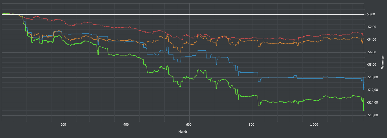 Я не знаю, что делать дальше. Осталось всего 10 долларов. Вы можете поинтересоваться, почему ev почти на месте. Все очень просто - оппам доезжает не только на коинфлипе, но и когда разыгрываем постфлоп. И я не могу понять, когда из "далеко впереди" слетаю на "далеко позади". Нет, правда. Меня ебали с любой рукой. Выебали, когда флопнул флеш - дважды! И оба раза выебали. Ебали, собирал я хоть допер, хоть стрит или трипс. Оппам похуй - им доезжала нужная карта, на терне или ривере, а я и не догадывался, что сейчас буду выебан. Меня ебали с тузами и королями - пушил я их на префлопе или слоуплеил. В первом случае ev идет вверх, во втором - вниз, в среднем - остается на месте, теперь понятно? Вот, такие дела.