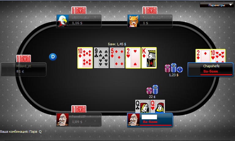 Начну, наверное, с того, что в мтт за 1-8$ в большинстве своем та же публика, что и в снг по 0.1$ на 360 рыл. Особенно это касается knockout'ов. В турниры они попадают через копеечные сателлиты и начинают, блять, играть в своем любимом бингодаун стайле, а я и не против, хоть диспа и шатается. Короче, было принято решение сыграть баунти за 7.5$. Вот ключевые раздачи: раз http://www.handconverter.com/hands/3077139 В том, что надо выставляться с дамами у меня нет сомнений, короли или тузы в их руках сродни редкому вымирающему зверю - хуй наткнешься, разве что очень редко. Но вот напоролся, переехал и, утроившись, всерьез стал рассчитывать хотя бы на итм. два http://www.handconverter.com/hands/3077133 Пиздец какой-то, все зашли в пот, демоны, а долбоеб передо мной вообще не понимает что творит. Минрейз на двух лимперов, охуеть. Моя ставка действия не возымела, увы. Хотел остаться с 1-2 оппами в раздаче. Флоп какой-то неприятный, решил чекнуть, а на терне выкидывать, если выйдет трефа, J или Q и ставить потбет, если будет бланк. Утг+2 обоссаная мразота, страшно припекло. И следующая же раздача номер три http://www.handconverter.com/hands/3077126 Понял уже, что мне пизда, что даже если один колит с фд, другой с оесд или гатшотом, остальные с гавном, то у меня даже при таком удачном раскладе не впечатляющие шансы.