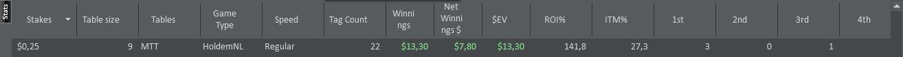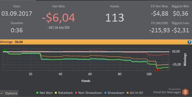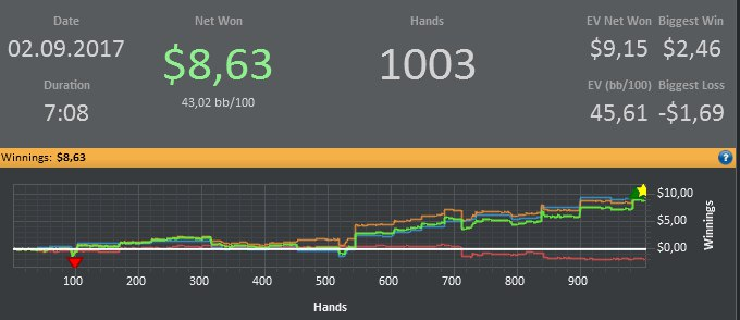На говновосьмерках бездеп размазан по времени в виде ежедневных 2х0.5$ билетов на любой турнир. Буду играть пополам турбоснг и мтт с дипстеками. Сегодня в снг был чиплидером в финале, но занял всего 6 место с наградой 0.81$, AKs<JJ. Пошел сразу кэш катать, ненадолго меня хватило. Тут выставился на флопе, даун вколил, рака яичек тебе. Жду начала мтт. Так и не разобрался с конвертированием и импортом раздач и не стану. ОПгалка сломалась. Всё.