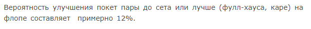 88:12=7,3:1 7,3 раза он будет проебывать 18ц, 1 раз надо выиграть 18ц*7,3 Для даунов специально подчеркиваю: это для сетмайнинга., предполагается что опп играет фит-о-фолд. Разумеется, он может вколить на флопе с оверпарой, тут почти любая карманка будет такой. И даже иметь какое-то адекватное эквити против моего спектра, а против АКо даже большое эквити. Но против карманки тут -$ев будет настолько небольшое, что для его уравновешивания надо ФЭ всего 20%, о чем я сразу и написал. Буду ли я тут его иметь? Пожалуй, да.