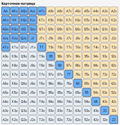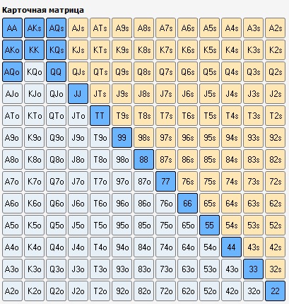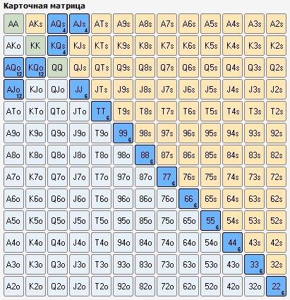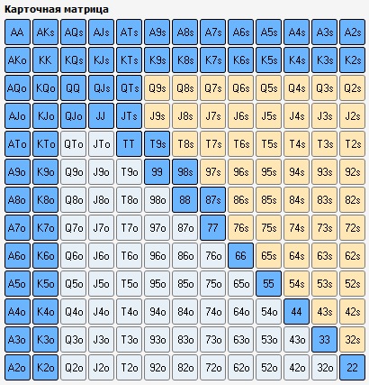 Итак, снова я. Составляю диапазоны 3бета и колла. Первый пик Утюг, второй пик МР и СО. Диапазоны беру тайтовые, хуле нл2 буду покорять, вроде должно хватить хотя бы для самого начала. А то стат нет, будет тяжеловато отличить оппов. Понятно, что неизвестный опп - рег, но тем не менее. Статы поднаберу, диапазоны порасширю. Итак, диапазон колла выделен синим, диапазон 3бета желтым. В диапазоне 3бета должен быть какой-то процент блефа, беру ниже минимума, там вроде 50\50 должно быть велью и блеф, но беру 1 блеф на 2 велью, может 1.3 блефа на 2 велью. Для начала думаю пойдет. Так вот, велью-диапазон вроде очевиден. А блеф-диапазон вроде как не должен состоять из того, что могу плюсово сыграть коллом, поэтому беру для блефа те руки, которые по EV идут сразу после диапазона колла. Все правильно делаю?