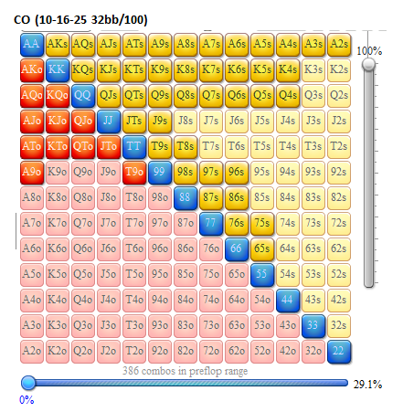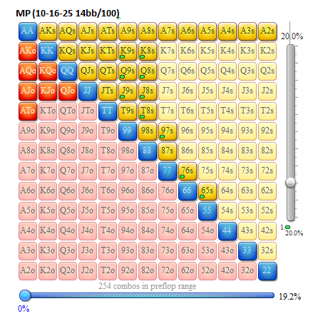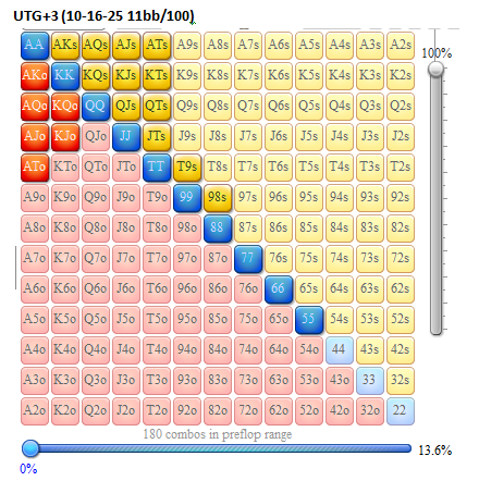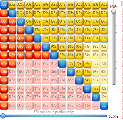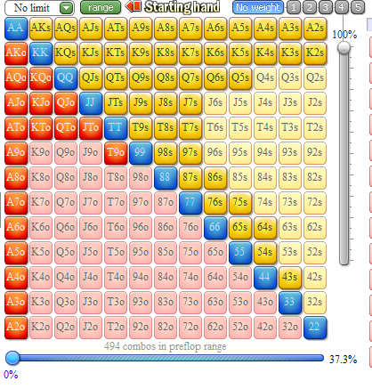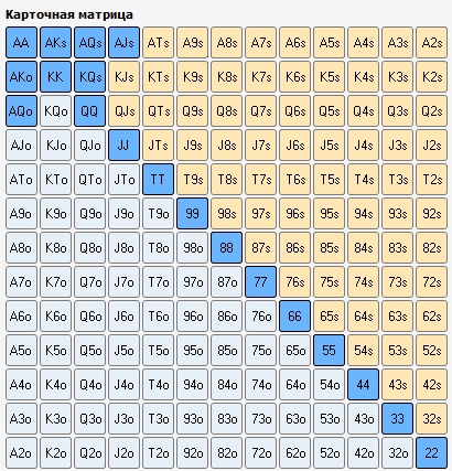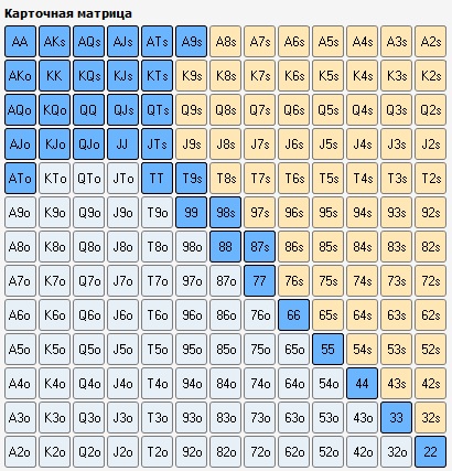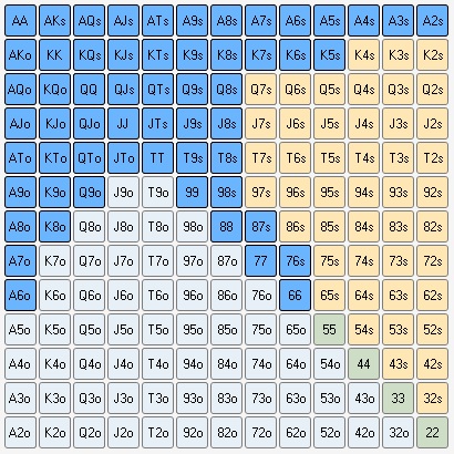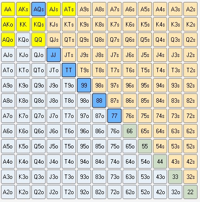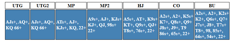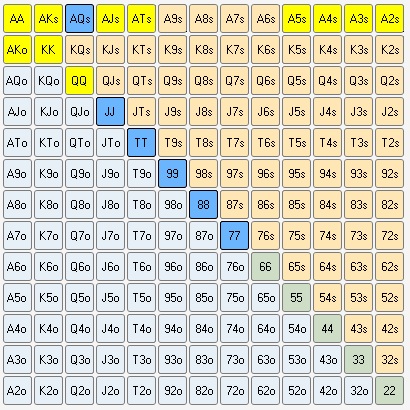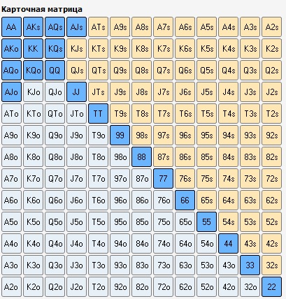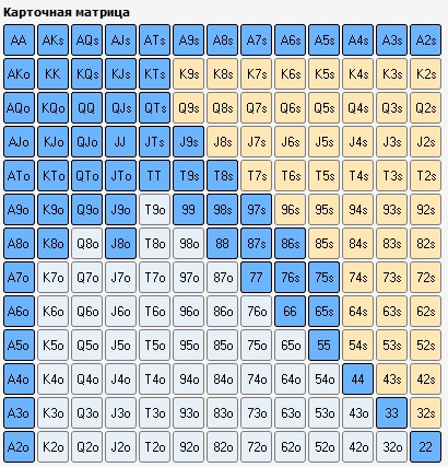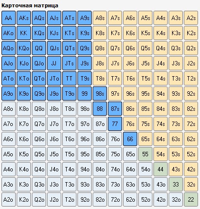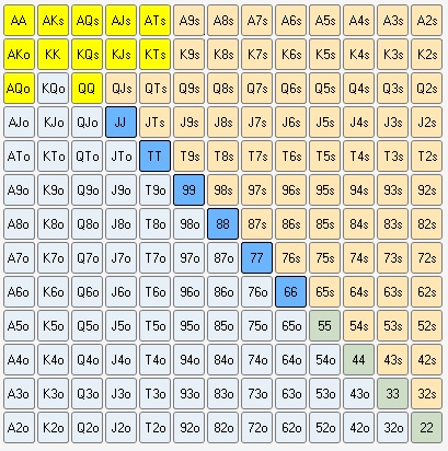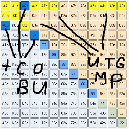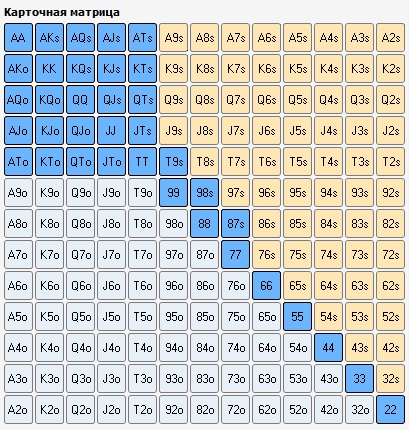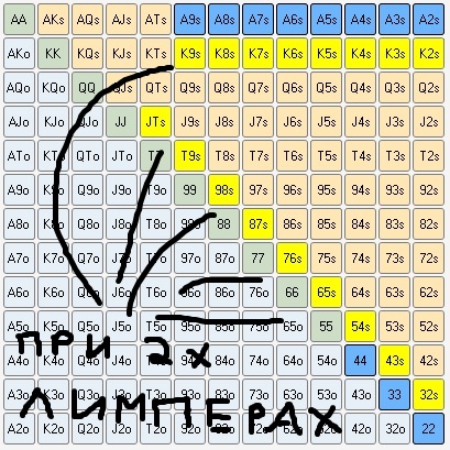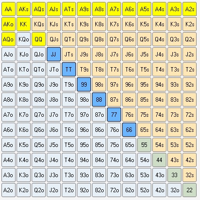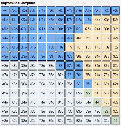 Скорее уж так: AA-66,AKo-A9o,KQo-K9o,QJo-Q9o,JTo-J9o,T9o,AKs-A2s,KQs-K5s,QJs-Q6s,JTs-J7s,T9s-T8s,98s-97s,87s-86s,76s,65s