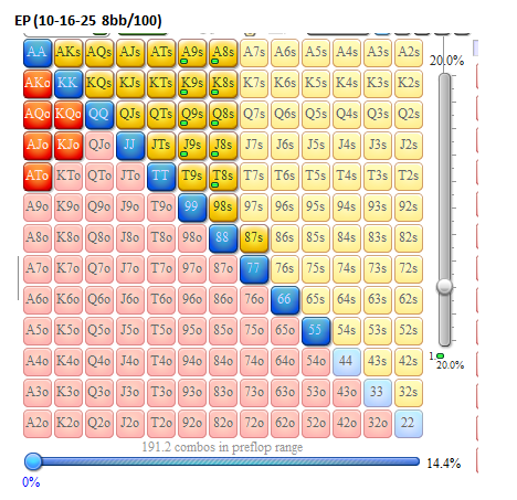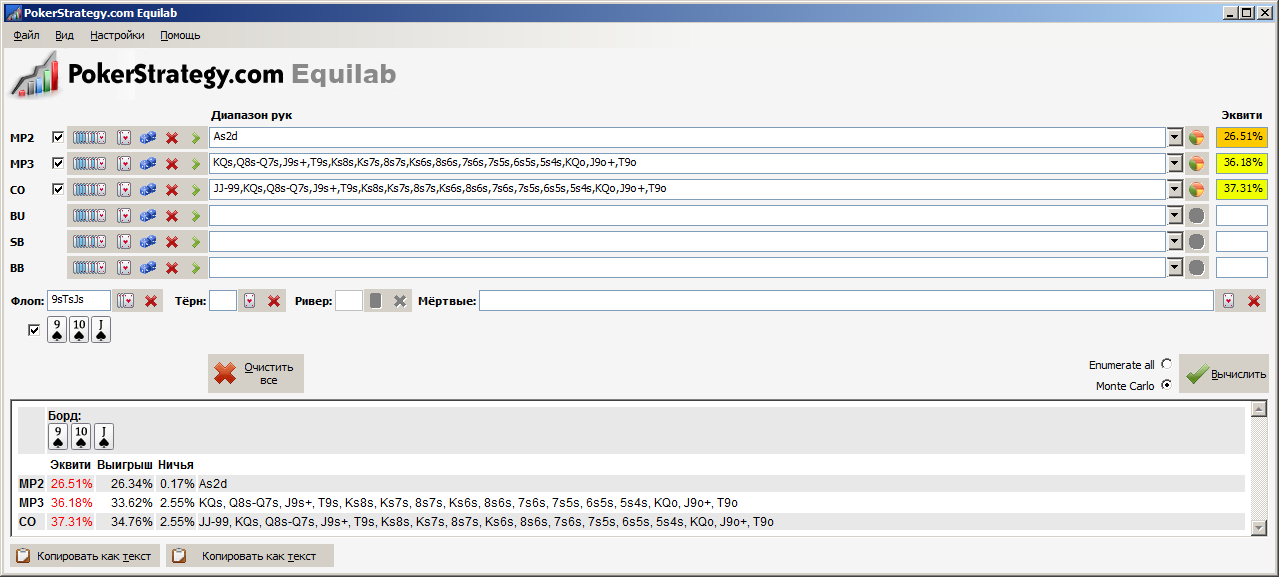 >>36101 Ну я же учусь потихоньку, не ругайся, бро. У натана в некоторых позах, да и блайндах от 78s идет, вот и я прилепил. В общих чертах понимаю, что такое эквити руки, но видимо не настолько хорошо, как нужно. Короче вот так получилось. Кстати фолдфлоп и фолд на стил меньше 50% должны быть, чтобы я так открывался? (и вообще, те ли статы я собрался смотреть) Да, а насколько шире должен быть диапазон на сдающегося? няша, потерпи чуть-чуть чарт ведь уже почти готов
