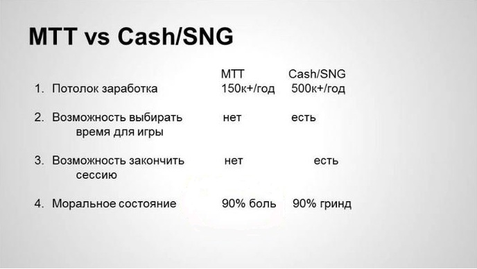 >>36156 В МТТ потолка заработка нет, ты можешь занести за год хоть 5кк, в кэше таких апстриков не бывает. Время для игры ты тоже выбирать не можешь, потому что днём игры нет. Ты не можешь остановить лудокатушку в кэше, иначе организм начнёт сиюминутно исторгать отравленную дебилами кровь. Моральное состояние 100% гринд, 148% боль.