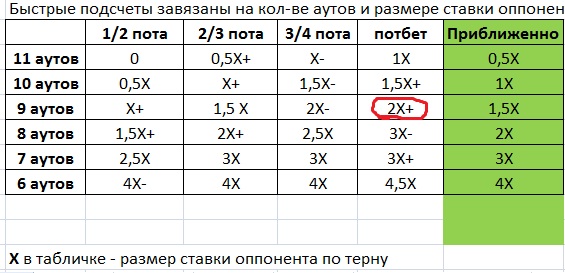 >>36204 Да хотелось бы получить какую-то простую схему, по которой действовать и сразу прикидывать. Допустим 9аутов, ставит полбанка - колл, ставит больше фолд и пр. Без ебания головы, чтобы изначально по какой-то схеме знать, отобьется ли оно. Понятно, что в таблице если смотреть, где 6 аутов и ебашат ставку в банк, нам по риверу нужно будет захуярить 4.5 его ставки и я не думаю, что кто-то будет равнять в принципе. Т.к. получится, что на терне на доске 100, он ставит 100, мы тоже, в результате на ривере 300, а мы делаем ставку в 450, т.е. овербет в полтора банка.