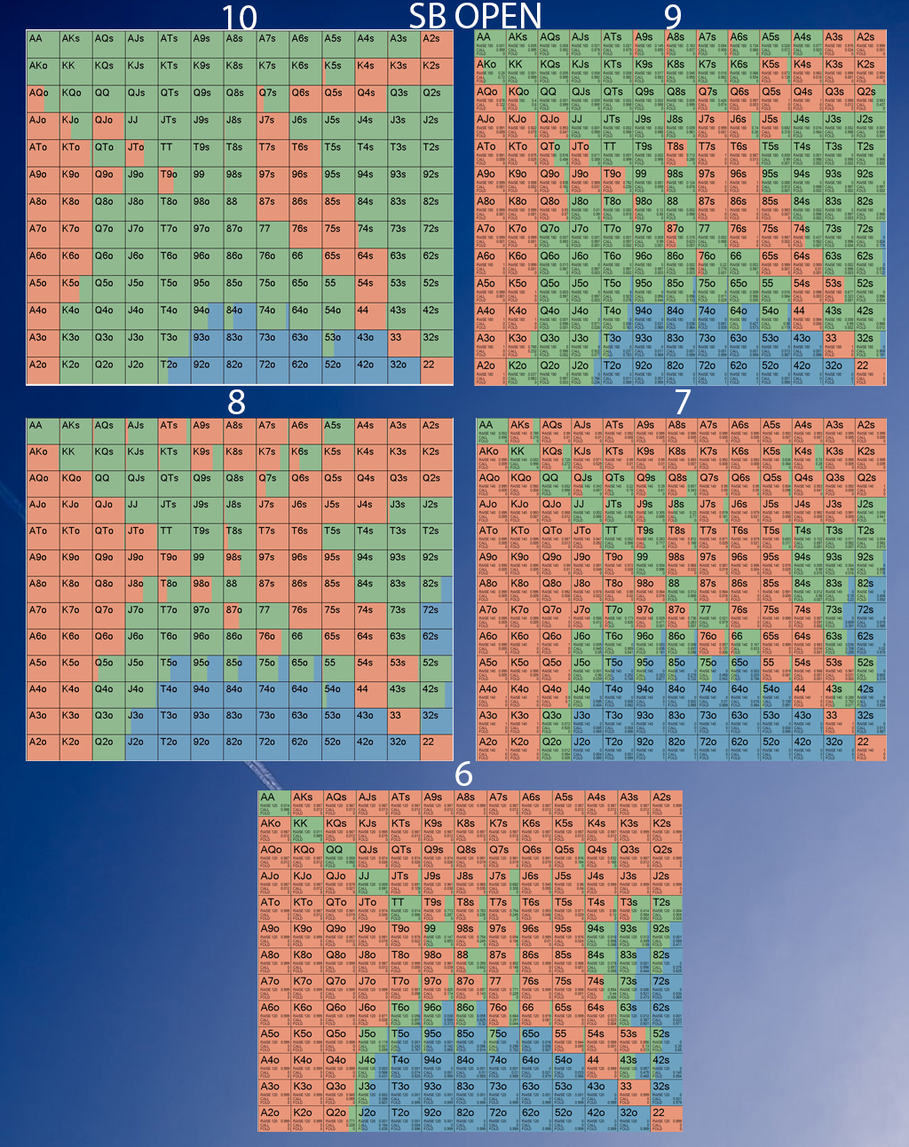 >>36073 >>36074 Хуита. Лимпы для фишей. Убирай их вообще или балансируй, примешивая сильные руки, лип/рейзы и лимп/коллы. ORP такие: UTG: 44+,ATs+,KTs+,QTs+,JTs,T9s,98s,AJo+,KJo+ MP: 22+,A9s+,A5s-A2s,KTs+,QTs+,JTs,T9s,98s,87s,76s,ATo+,KJo+,QJo CO: 22+,A2s+,K2s+,Q7s+,J7s+,T7s+,96s+,86s+,75s+,65s,54s,A5o+,KTo+,QTo+,JTo,T9o BU: 22+,A2s+,K2s+,Q2s+,J7s+,T6s+,96s+,85s+,74s+,64s+,53s+,43s,A2o+,K9o+,Q9o+,J9o+,T9o,98o SB: 22+,A2s+,K2s+,Q2s+,J7s+,T7s+,96s+,86s+,75s+,64s+,54s,A2o+,K8o+,Q8o+,J8o+,T8o+,98o,87o