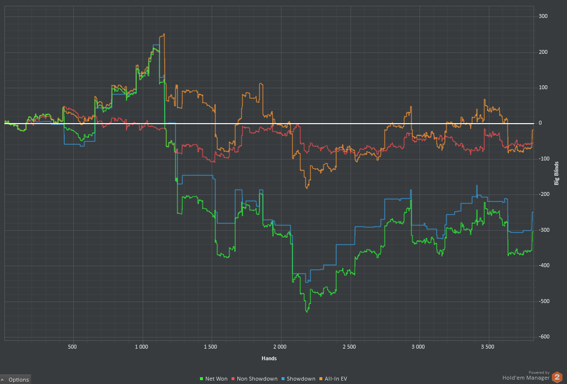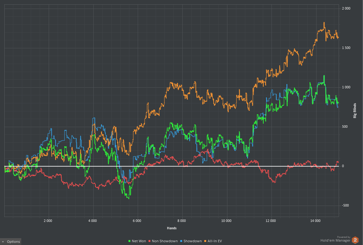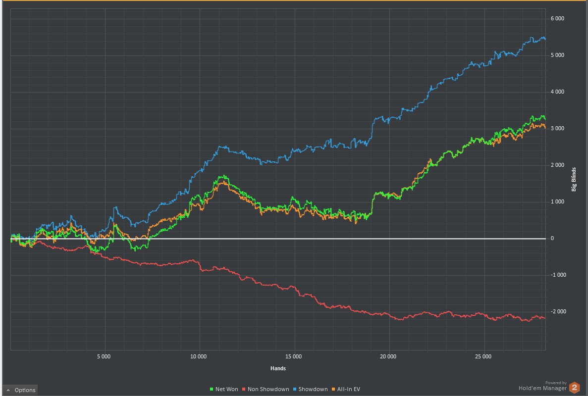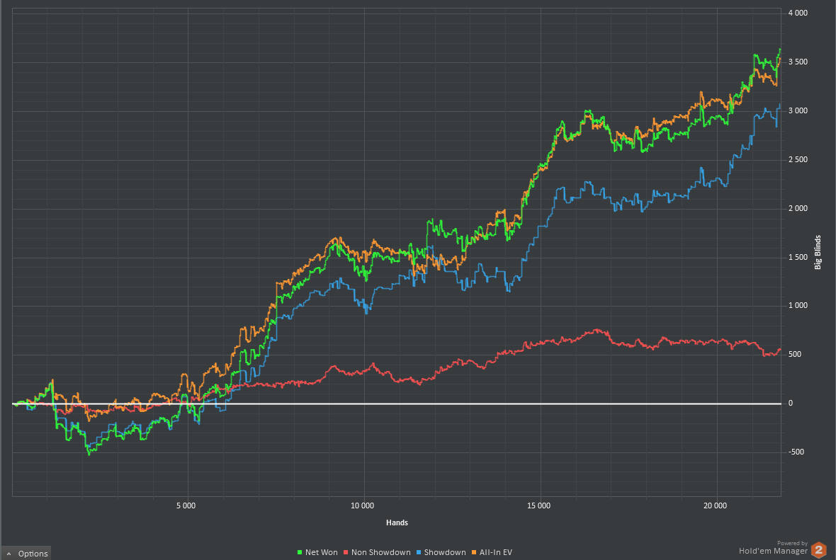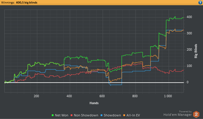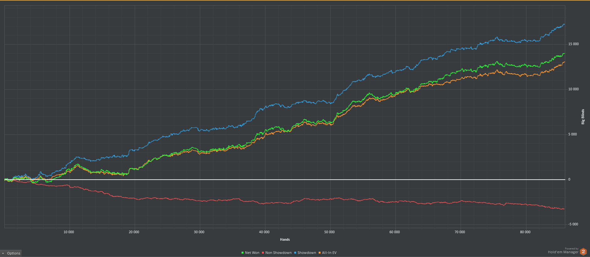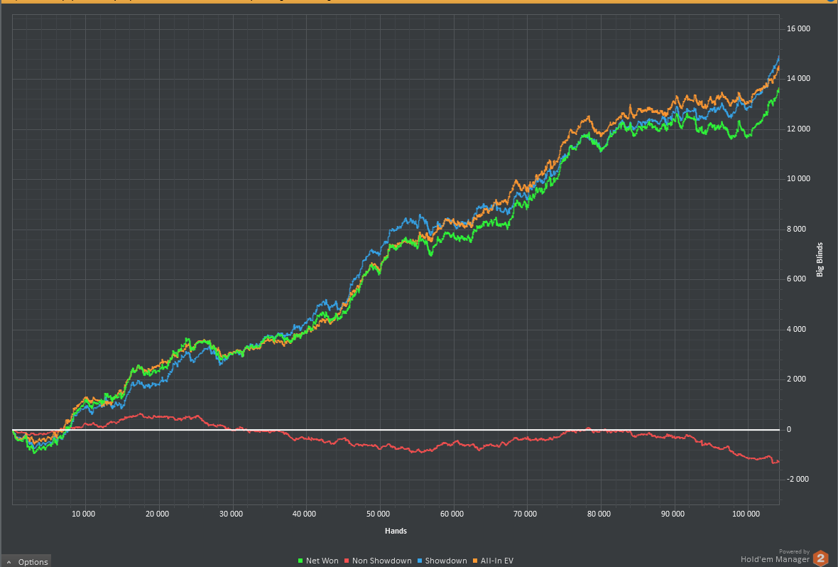 >>40236 Ну смотри, поиграл сейчас час за 6 сх столами, т.е. сыграл где-то 500 раздач. Выиграл 7би, т.е. 700bb\500, т.е. 120bb\100. Ну это конечно заебись там шло и заходило, но тем не менее. На вооружении у меня только чарт опенрейза, краем глаза поглядывал, что делать с 3бетом, ну где-то далеко в памяти шансы есть и их примерно прикидывал на глаз.