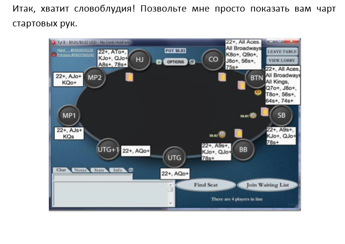 Там выше писали, что с утюга 3бетить некого. Я понял, почему в курсах все-таки есть диапазоны колла 3бета с утюга - потому что там есть тема лимпов, его не рекомендует использовать, но мол можно когда-то лимп\3бет или еще как-то. Но до этого мне еще долго, а может и вообще нахуй не нужно. Но хоть стало ясно, для чего в конспектах есть чарт. >>39834 >>39835 Ну вот смотрите, на первом пике диапазон колла чужого открытия в зависимости от опенрейза оппа. Стат полный ноль, лимит нл2, опыта ноль, в связи с чем взял самый тайтовый для самого начала. Пик номер 2 диапазон 3бета против регов, у меня все оппы неизвестные, поэтому изначально принимаю всех за регов. На обоих пиках позы МР и СО показаны одними и теми же диапазонами, поэтому и у меня чарты для них не отличаются. Я не сам все это придумывал. Единственное, что я блеф добавлял, чтобы был диапазон полярный, а не линейный и на дикий эксплоит чтобы не нарваться. Я допускаю, что мог дорисовать блеф не теми комбами и не в том количестве. >не понимаешь что делаешь и не играешь в покер, не можешь понять кто тебе будет противостоять и что с ними делать. И это неизбежно, если ты вкатываешься в покер совсем без практики Ну так блядь не вкатившись все равно ведь практику не наиграешь, просто хочу изначально знать, что делать. Ну хотя бы в каких-то рамках. >ТЫ ВСЕ ЭТО ВРЕМЯ НЕ ТЕМ ЗАНИМАЛСЯ! Ну я это допускал, что сказать. В данный момент по имеющимся конспектам накидываю схему игры. Буквально за 3 последних дня уже половину конспектов перерыл. При таком раскладе к следующим выходным играть уже должен начать, правда еще ХМ2 нужно будет установить и настроить. Ну вы уж подкорректируйте мою деятельность, если что.