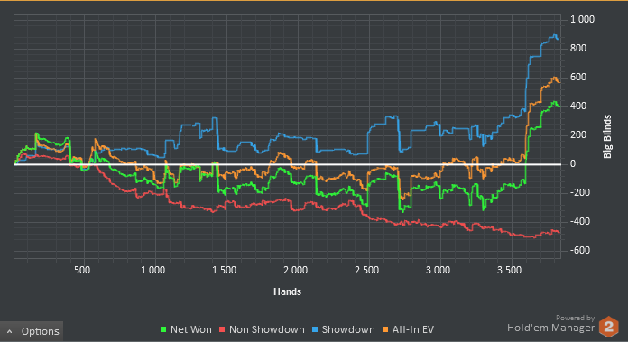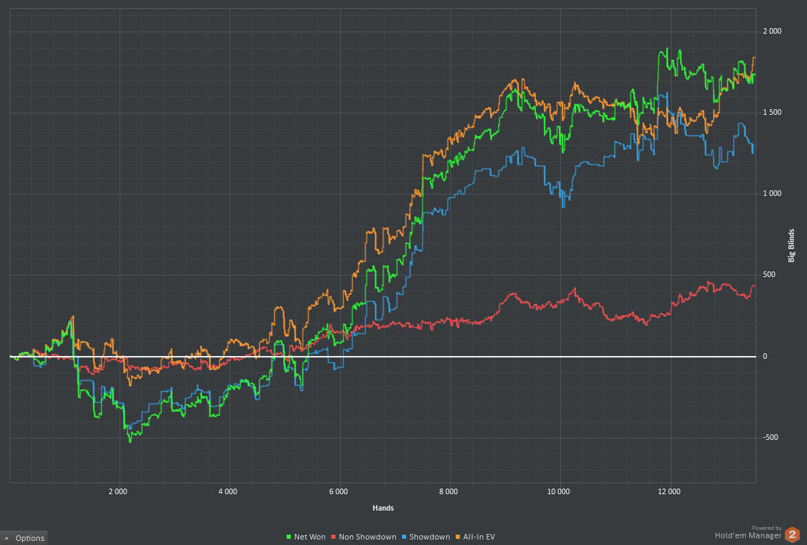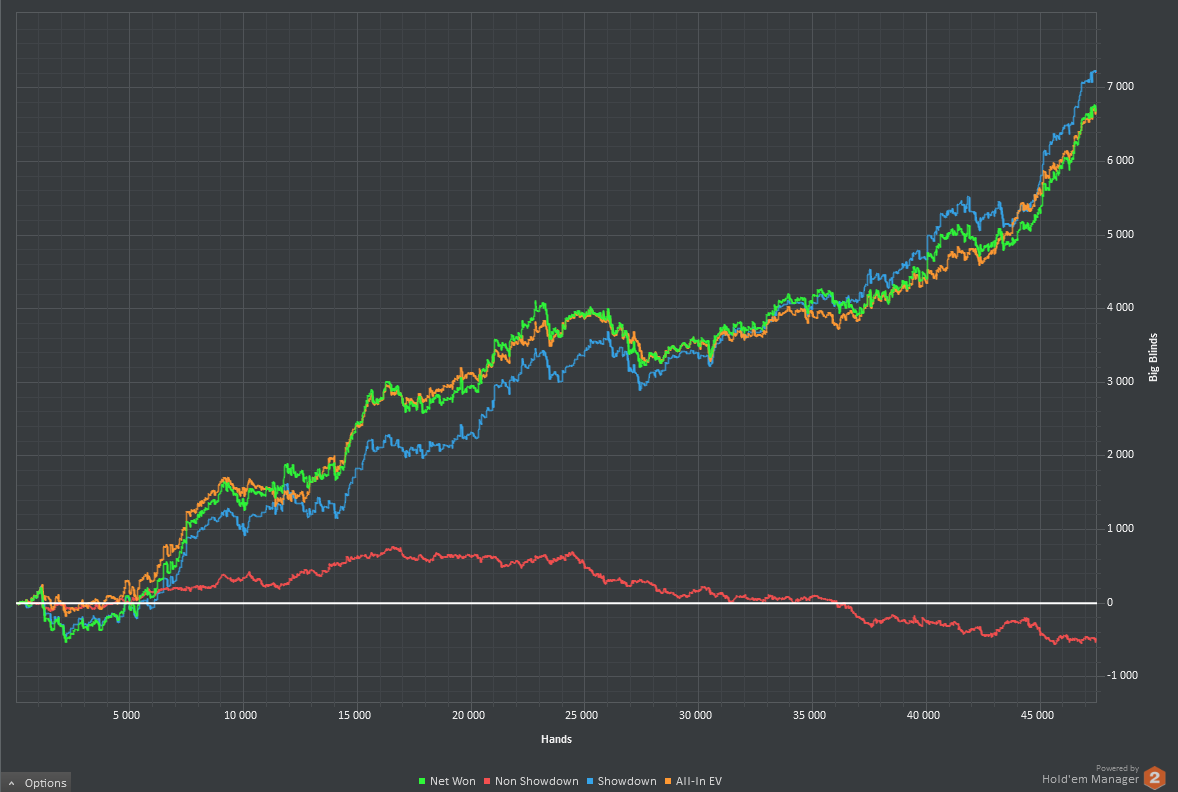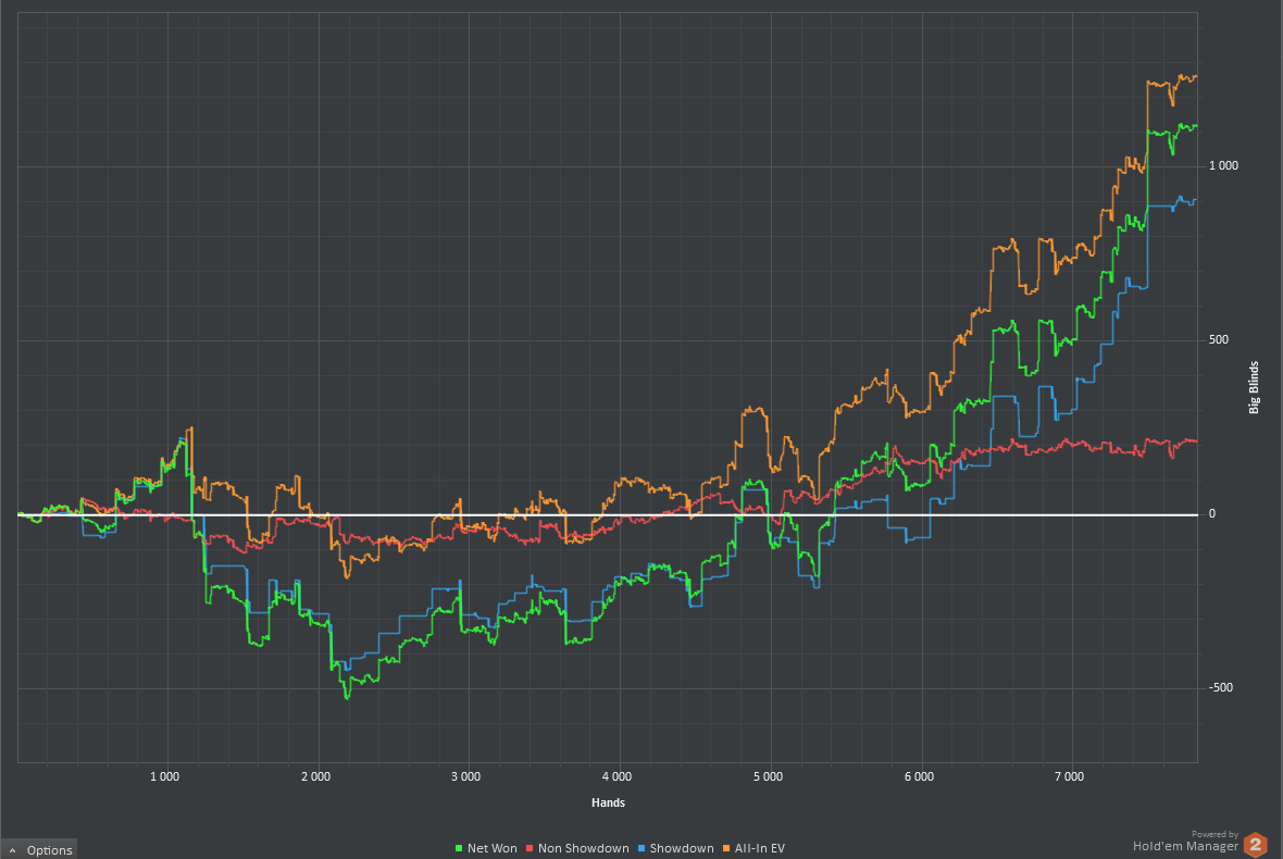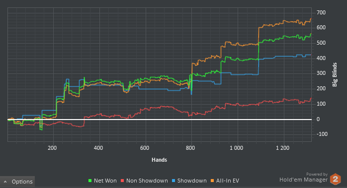 С нл2 пока конечно не заставлю себя всё перейти и вывожу стабильненько. Ибо с дисперсняка на фл накопилось всякого и расплачиваюсь. Но больше на всякое мне выводить не нужно. Да и винрейт 15бб/100 слишком уж нравится. Сейчас хочу лишь заставить себя стабильно отыгрывать по 4-5 часов в день плюс часик на разбор и теорию минимум выделять. Сентябрь вышел так и в конце месяца заболел на неделю, и до 100к в итоге так и не доиграл.