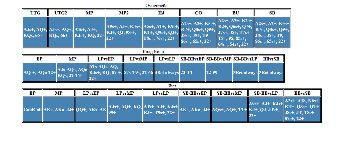че-то ебаная галочка "оп треда" перестала работать, наверно после переустановки винды Ну че, пытаюсь запомнить диапазоны открытия путем дрочева на плейманях да, я долбоеб но по ходу этого дрочева возник вопрос, ответ на который отсутствует в кмб корсика. Какой диапазон открывать с ВВ, если допустим мы остались с SB один на один, ну он закомплитил, или помимо него еще кто-то лимпом зашел. У меня есть чарт колла чужого опенрейза, а также чарт 3бета чужого опенрейза. А вот именно чарта открытия до 3bb, если за столом лимеры, у меня нет. Единственное, что глянул натановские чарты, там диапазон ВВ и SB совпадают в плане открытия, хотя сами диапазоны откровенно неправильные, их уже обоссывали неоднократно. Короче помощи прошу, запилите, с чем открываете из ВВ, ну понятно, что там все от стат и пр., но все равно какой-то чарт должен быть. Допустим на SB диапазон открытия у меня пикрилейтед.