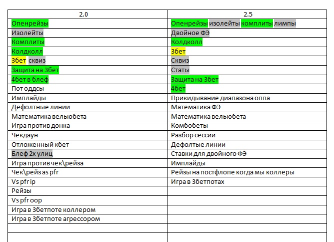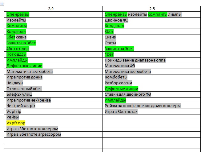 Докладываю. То, что выделено серым, отложено на потом, т.к. те моменты уже идут от стат и пока мне их не изучить. Зеленым отмечено то, что уже практически выучил и научился применять на плейманях, ну разве что диапазон 3бета похрамывает, т.к. очень редко приходится его применять, но главное, что опенрейз почти выучил, уже могу играть на 6 столах и практически не подглядываю. Желтым выделено то, что хочу тоже довести до автоматизма перед вкатыванием. Короче все вот-вот, как обычно. А сегодня чутка бухну, да отдохну от карт, т.к. автор книг про покер - игры разума настоятельно рекомендовал заниматься картами не больше 5 дней в неделю ну мы-то с вами знаем, что я просто алкаш и повод нашел Короче никуда я не пропадаю, развиваюсь, двигаюсь, на месте не стою. и уже перекат надо будет делать, тред в бамплимит ушел, а я еще не вкатился, лол плеймани-кун