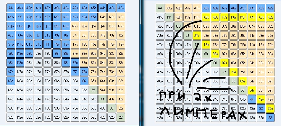Короче обосрался я с рисованием диапазона блефового 3бета, там нужно Ахs хуячить, а не по велью. Ну что делать, перерисую. В данный момент такая ситуация - зеленым выделено то, что сделано и готово к игре. Серым выделено то, что на мой взгляд нахуй не нужно для битья нл2. Желтое то, что делаю в данный момент. Все двигается, приближаемся ко вкатыванию.