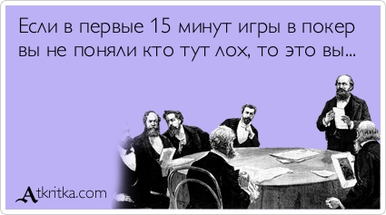 >>41366 сука наиграл вчера 200 баксов в зум покере, где минималка 25 на вход, а сегодня че-то не мой день - то в конце карта обязательно придет чтоб моя рука в ноль ушла, то еще че, пизда обидно