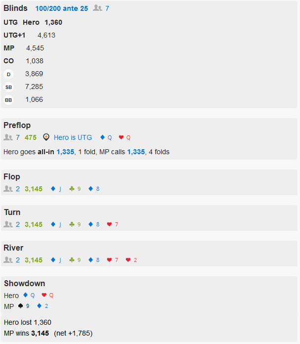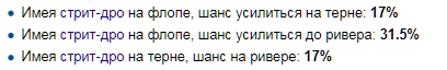 Поскольку мы уже знаем, что стрэйт на терне нам доедет лишь в 17%, это означает, что нам можно коллировать ставку не более чем 17% от этого банка. А так как нам предлагают заколлировать больше 17%, то нам нужно фолдить. На дистанции мы будем проигрывать деньги, если заколлируем.