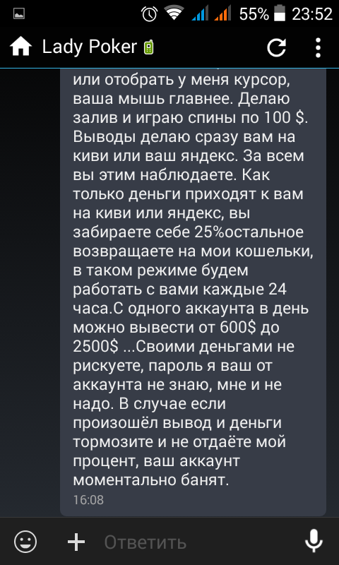 >>37799 Пилю прохладу. Думаю будет полезна. Меня так знакомые затянули в эту хуйню. Предложили им какой-то поц с форума схему. У него бот, который обыгрывает старсы в Блекджек. Обыгрывает так жестко что лимиты на кешаут не дают с его акка все выводить. Вот и нужны ему новые. Ну я на тот момент уже полгода как не играл и решил что забанить акк за 200$ обещанных самое то будет напоследок. Понимал что все не так чисто, но обыграть казино ведь святое дело! В итоге оказалось это самый обычный кардинг и способ отмыва пизженных денег. Пацан сидит с вашего компа под ТимВьивером и для начала крутит спины, а потом пиздует в блекджек. Короче в конце концов на меня старсы повесили долг в 1000$ баксов и на моих знакомых также. Людям пизженное вернули за свой счет, а мне прислали мыло с просьбой указать виновного в этом всем, которое я благополучно заигнорил. Хорошо что акк был не верифицирован. Ничего я не вывел лол потому что этот хуй ничего не выиграл, а депал он с карт Австралии, Эстонии и еще других стран. Надеюсь никаких кар анальной жёппы за этим не последует. Кроме как пожизненного блока моего ака на старсах.