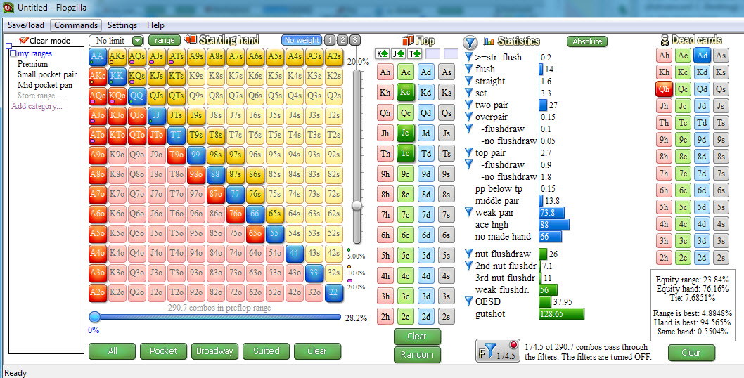Вообще и флопзилла для этого не сильно поможет. Там можно поставить что в рендже половина АК, а дальше поставить что с трефовым тузом бетятся, а с королем чекаются нельзя. Очень неудобный софт.