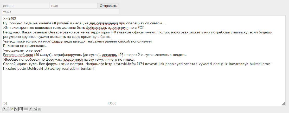 >>42389 В РФ запретили переводы с пометкой "на азартные игры", тебе что SMS на телефон не приходило, когда платёж не проходил? Теперь можно депозитить только через электронные деньги (вебмани, киви, битки, скрилл и т.п.) или через карту Visa, полученную и зареганную не в РФ.