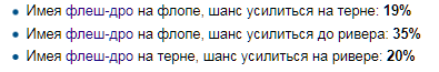 >>38070 >Пруфай свое заявление. >Математика показывает то что показывает. Она верна Не верна, она показывает шансы рук 1 на 1 при остальной полной колоде. Все эти калькуляторы никак не учитывают, что в каждой конкретной раздаче, на 9-макс столе, есть еще 7 человек с 14 картами на руках и от того, какие это карты, шансы меняются очень сильно. У человека вообще уже может не быть аутов, а твой калькулятор будет тебе показывать 20%. Это и есть рендом, в РЕАЛЬНОМ покере, а не калькуляторном.