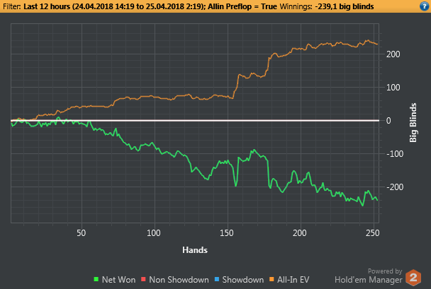 Именно поэтому просмотр графиков во время игры - это губительная для профессионала привычка. И проигрыш и выигрыш отклоняют нас от оптимальной игры. Вся наша карьера в покере - это одна большая сессия и разбирать ее на слишком мелкие участки(даже по 200-500 турниров, если говорить о спинах) не имеет никакого смысла. Я корю себя ха то, что смотрю графики на 100-200 турниров, но у меня вызывает еще больший смех и негодование, когда люди скидывают свои результаты за 20-30-50 турниров. Вы можете сказать: но ведь нужно работать над игрой, а как это делать без графиков? Однозначно, но не на 200 турниров, а на 3-4 тысячи. На мелкие дистанции это не лики, а тенденции и сказать на чем они основаны: дисперсия или плохая игра нельзя. Но все же я даже говорю скорее о совсем маленьких дистанциях. Уж точно вы не найдете лики на графике в 50 турниров, а вот ваше ментальное состояние может сильно измениться.