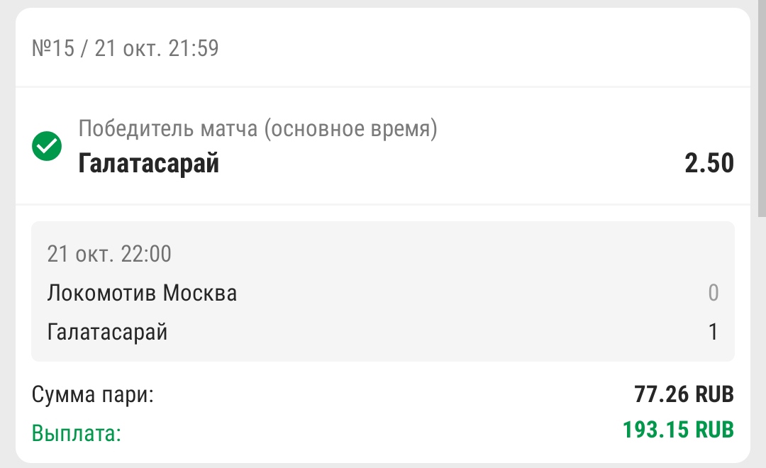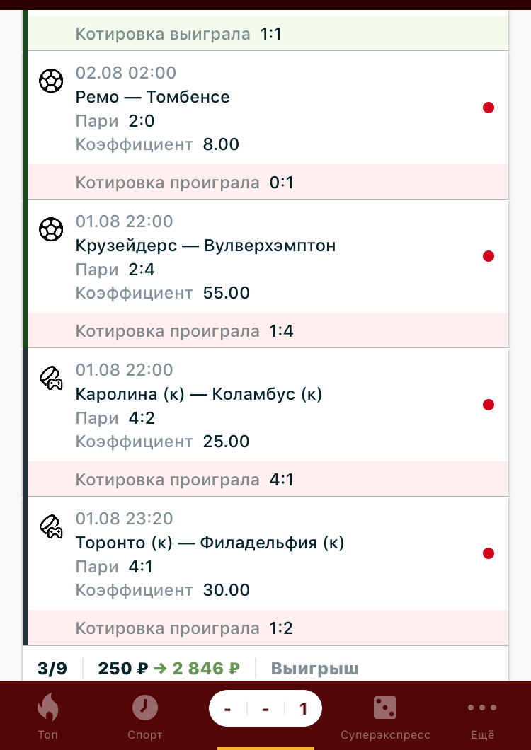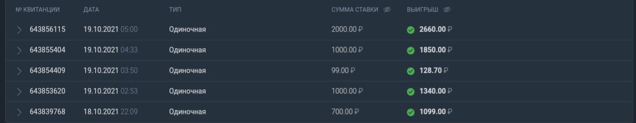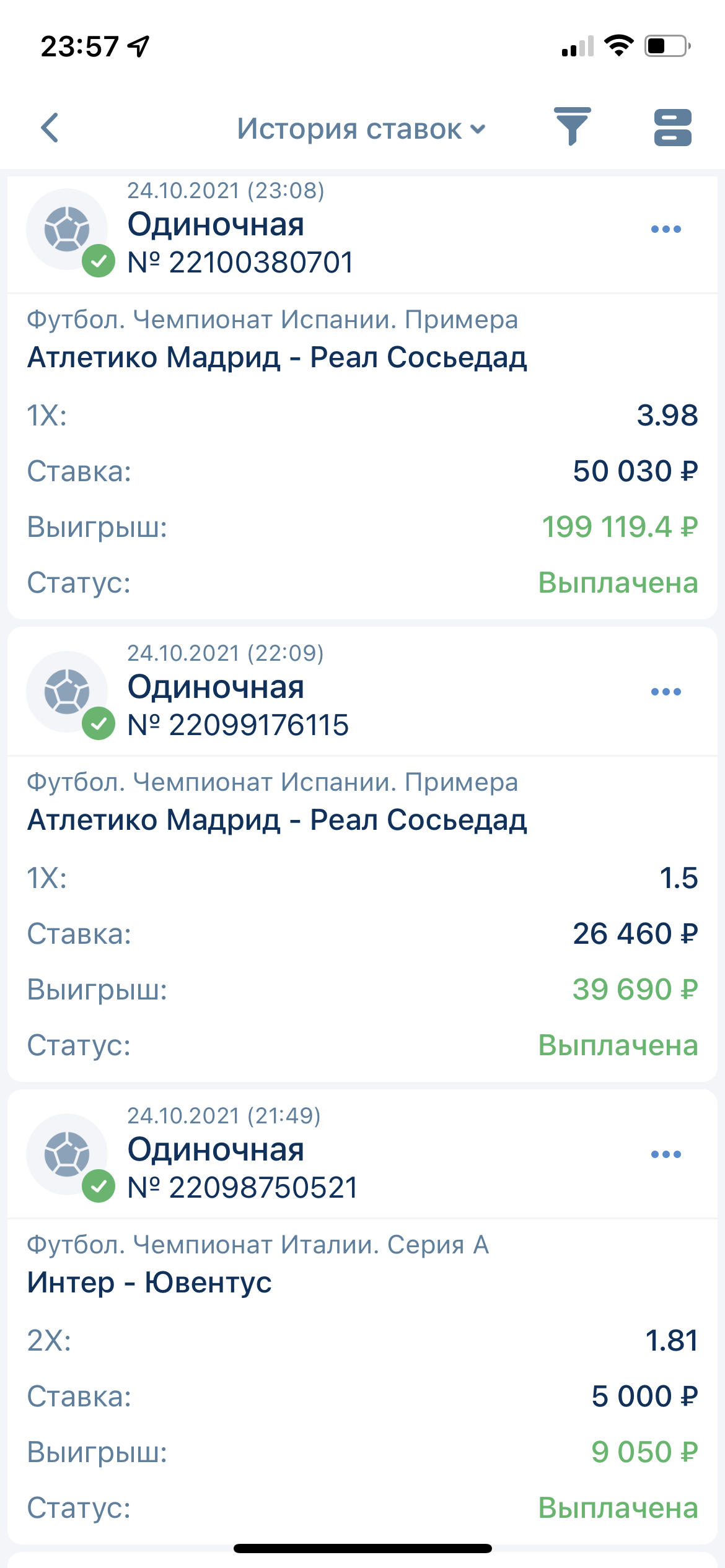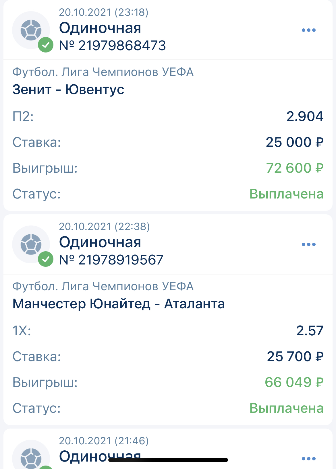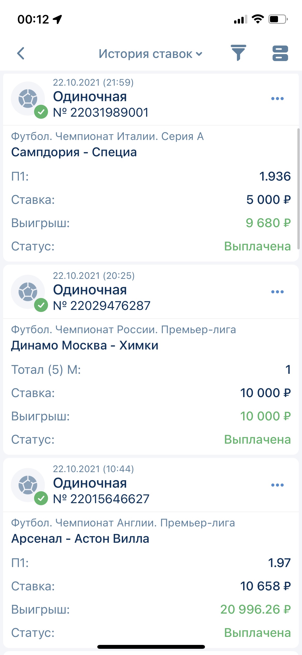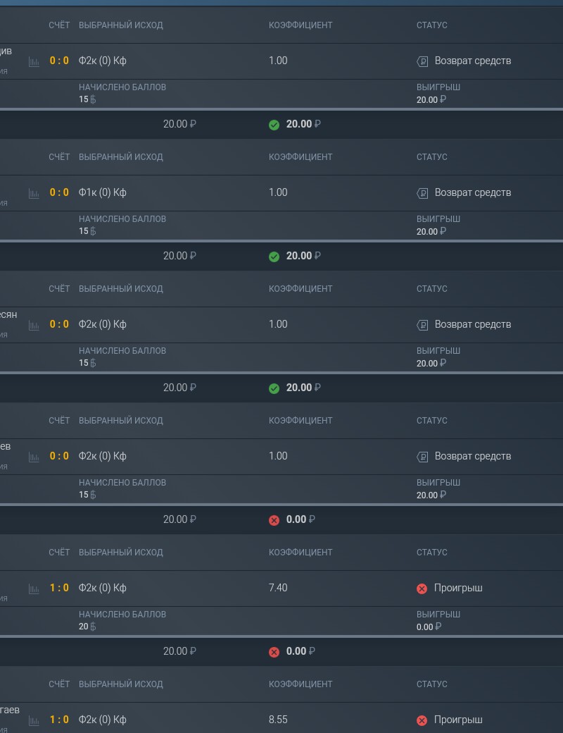 Однажды я сделал ставку на последние гроши и выиграл 27к. Хуй знает что там за маловероятное событие было, но это был футбол, год 2015 наверно. Было пиздец как приятно умножить свои 300 рублей в десятки раз, но я подобных раскладов больше не встречал.
