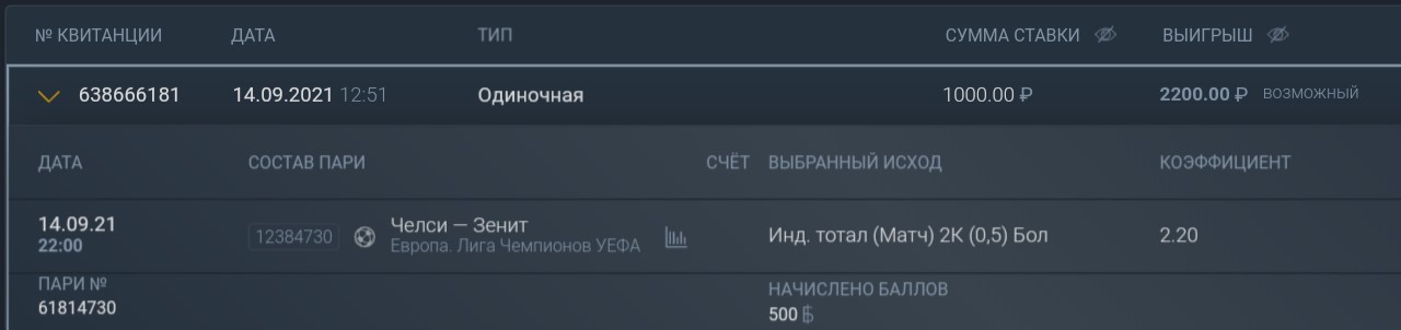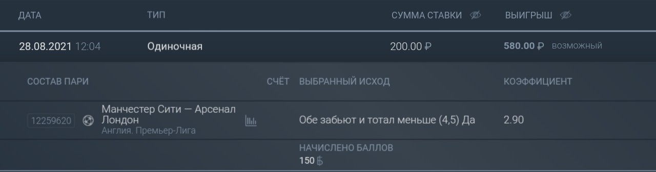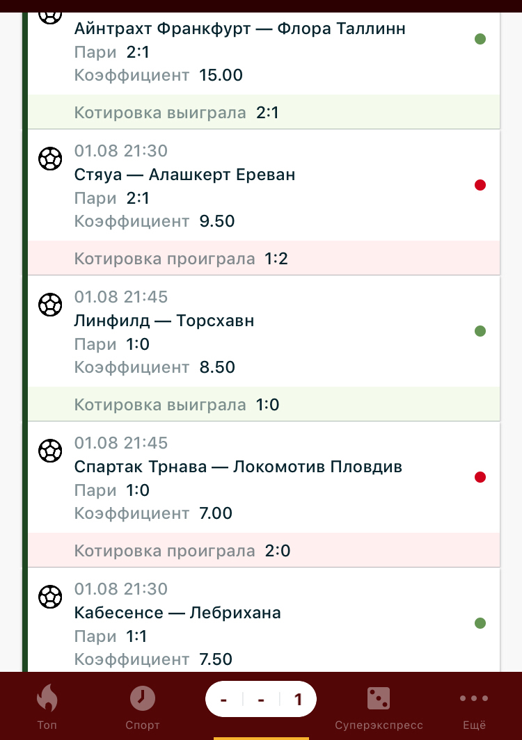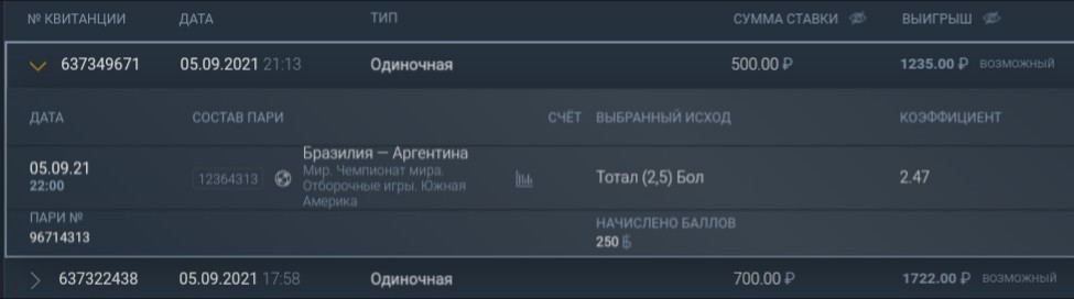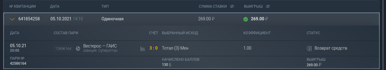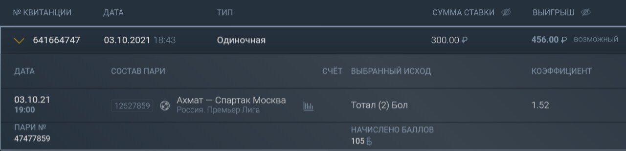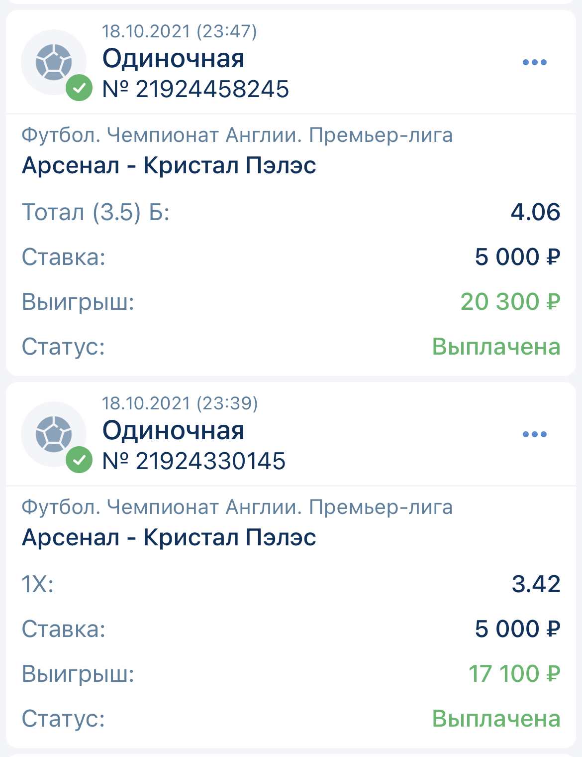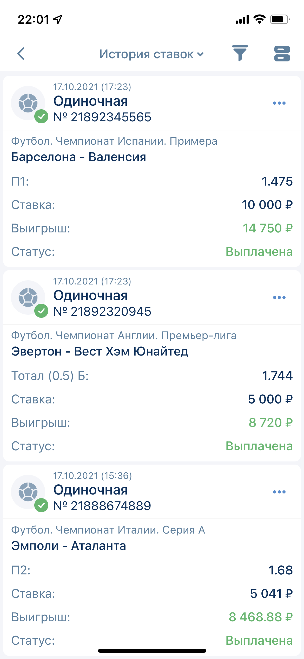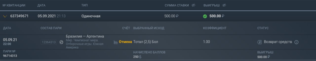 Однажды я сделал ставку на последние гроши и выиграл 27к. Хуй знает что там за маловероятное событие было, но это был футбол, год 2015 наверно. Было пиздец как приятно умножить свои 300 рублей в десятки раз, но я подобных раскладов больше не встречал.