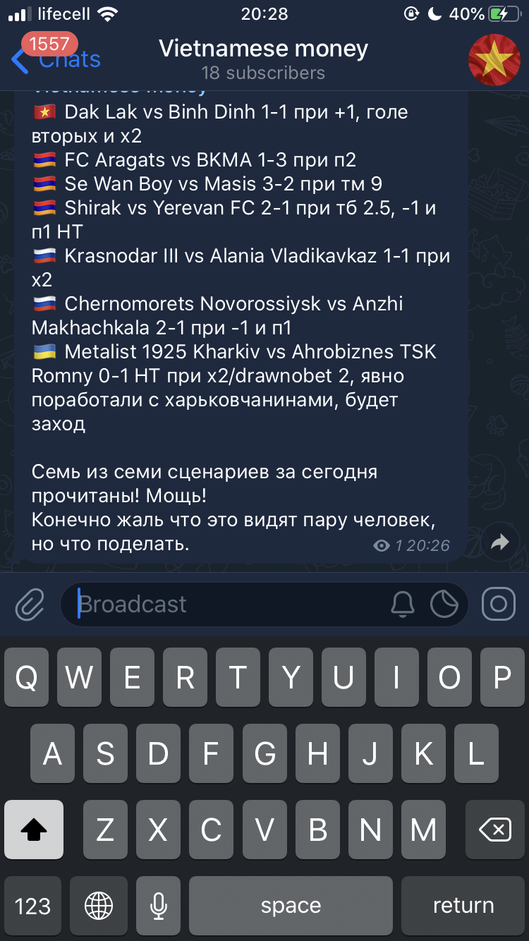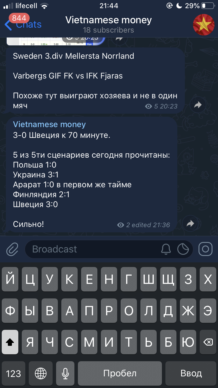 Бредовая хуйня, НО,по прогнозам стараюсь искать группки с наименьшим числом подписоты Они пытаются причвель аудиторию, зачастую покупая платные прогнозы и нахаляву отдают, дабы им доверяли. Обычно нахожу парочку и сверяю между собой В итоге составляю и экспры и просто ставлю Заходит обычно, главное внимательнее быть Вот например телега и вк. В вк высратышей дохуя, а в телеге вот например они @vipftbl