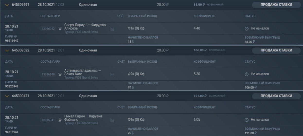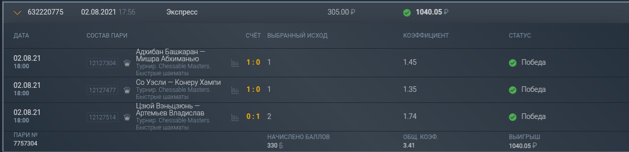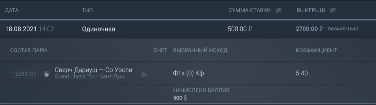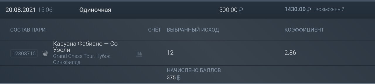 Стрёмно брать сегодня шахматы, но попробую ради интереса. Буки почему-то свято верят, что в партии Уэсли Со - Шахрияр Мамедьяров будет пат (самый низкий кэф на ничью), а мне вот кажется, что будет П12 за кэф 2.94.