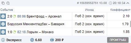 Кэфы повыше - от 1,56 до 1,7 - должны отпугивать игроков, но у меня они заходят с неплохой регулярностью. Правда, выборка мала. Будем смотреть дальше. Здесь результат +3 флета.