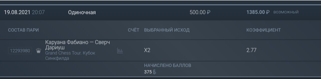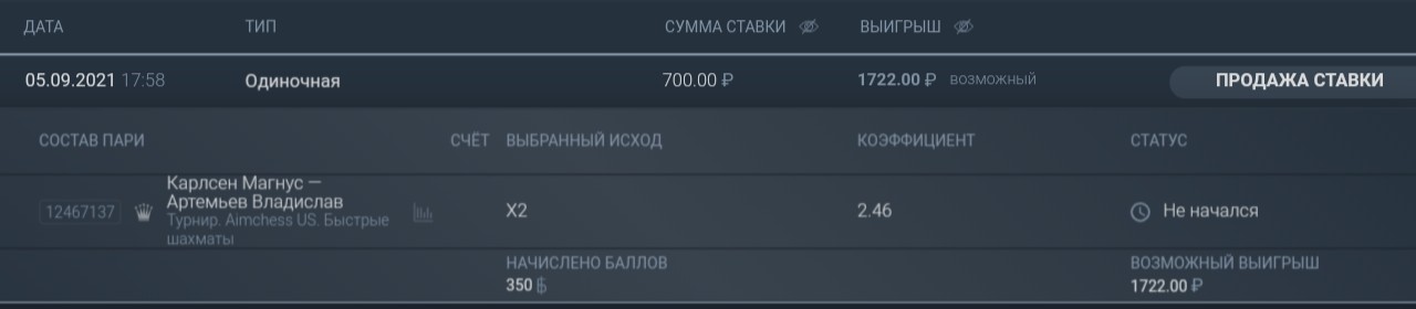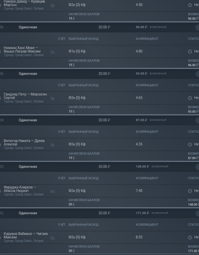 Кстати, в шахматных турнирах частенько дают неплохие кэфы на П12, вплоть до 1.8. И по сути это валуй, потому что ну не надо быть гением, чтобы понять, что вероятность победы кого-то выше чем вероятность ничьей.
